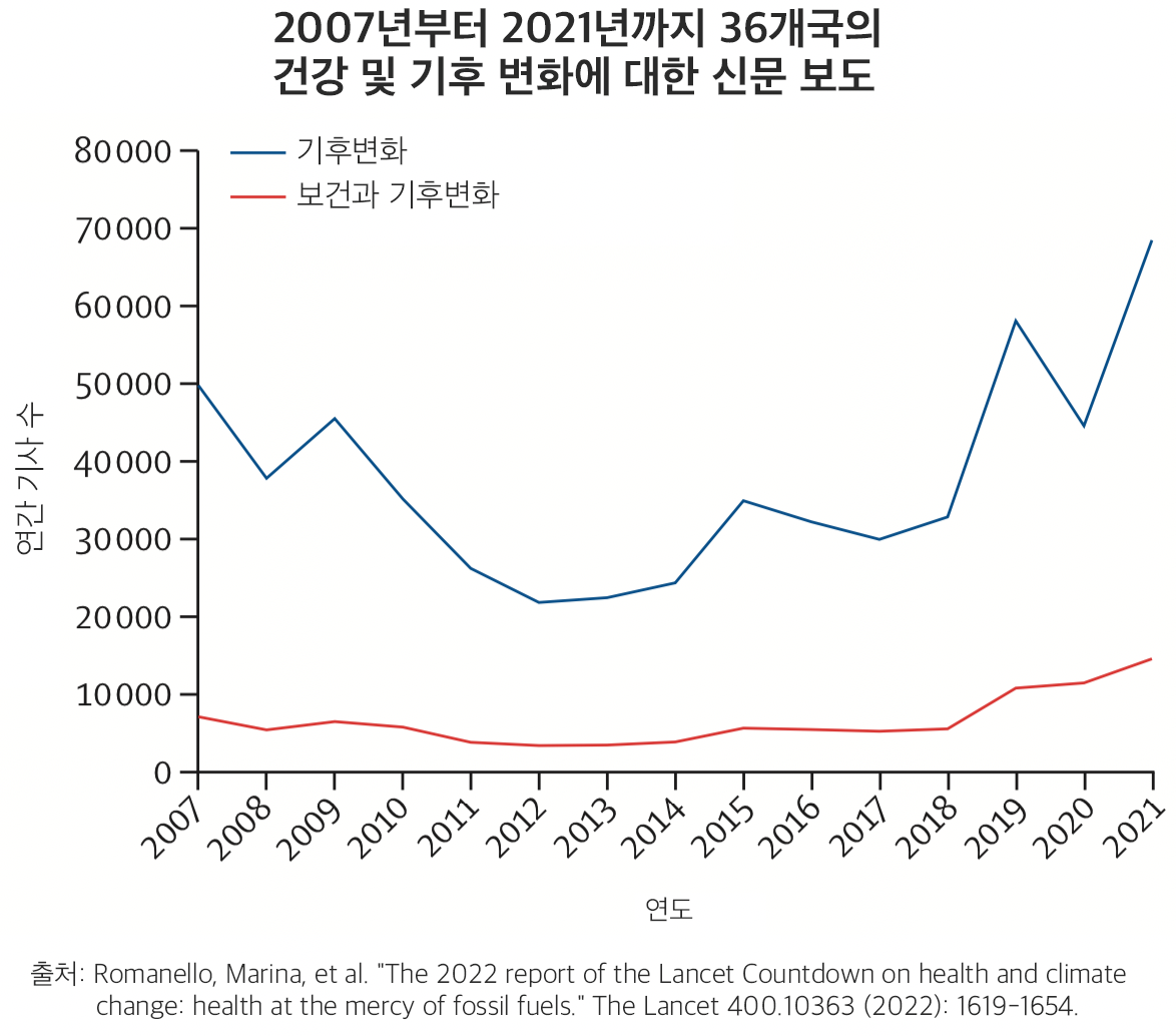 세계보건기구(WHO), 세계기상기구(WMO), 세계은행 등을 포함한 전 세계 35개 이상의 파트너와 협력하여 기후 변화와 건강 간의 연관성을 추적하는 보건과 기후변화에 관한 랜싯 카운트다운 2022 보고서(The 2022 report of the Lancet Countdown on health and climate change)가 지난 10월에 발표되었다. 이 보고서는 세계적으로 가장 영향력 있는 의학 저널의 하나인 랜싯(Lancet)을 발간하는 랜싯 위원회가 2015년 '기후변화에 대처하는 것이 21세기 최대의 글로벌 보건 기회가 될 수 있다'는 판단 아래 정책 입안자를 참여시키고 보건 전문가를 지원할 수 있는 글로벌 모니터링 시스템의 필요성을 위해 2016년부터 발간되기 시작했다. 올해 보고서는 세계 에너지 위기의 영향과 현재 진행 중인 코로나19 팬데믹의 영향을 복합화하는 기후 변화의 건강, 사회 및 경제적 영향에 대해 국가와 보건 시스템이 씨름하는 가운데 발간되었다. 2022년 보고서는 5개의 핵심 영역과 43개의 지표에 걸쳐 건강과 기후 변화의 관계를 추적하여 세계가 중요한 시점에 있다는 것을 보여준다. 이 보고서는 동시에 화석 연료에 대한 새로운 과도한 의존은 보건에 미치는 영향이 악화되어 치명적으로 온난화된 미래를 인류를 가둘 수 있지만, 보건 중심의 저탄소 대응은 세계 인구가 생존할 수 있을 뿐만 아니라 번영할 수 있는 미래를 제공할 수 있는 새로운 기회를 제공한다고 강조한다. 이 글은 랜싯 카운트다운 2022 보고서 The 2022 report of the Lancet Countdown on health and climate change: health at the mercy of fossil fuels 개요서(executive summary) 번역으로 기후변화가 건강, 전염병 확산, 경제와 노동, 농업, 의료에 미치는 영향을 분석하고 대응 방안을 제시하고 있다.