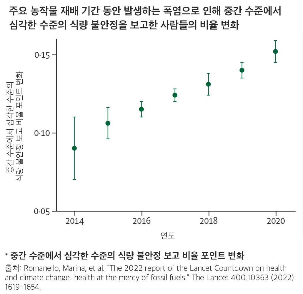 다양하고 상호 연결된 경로를 통해 식량 안보의 모든 차원이 기후 변화의 영향을 받고 있으며, 다른 공존하는 위기의 영향을 악화시키고 있다. 2020년에는 옥수수의 성장 계절이 평균 9일 단축되고, 겨울 밀과 봄 밀의 성장 계절이 1981-2010년보다 6일 단축되는 등 기온 상승이 농작물 수확량을 직접적으로 위협한다. 농작물 수확량에 대한 위협은 극단적인 날씨가 공급망에 미치는 영향, 사회경제적 압력, 감염병 전염 위험을 증가시켜 식량 가용성, 접근성, 안정성 및 활용도를 저하시킨다.