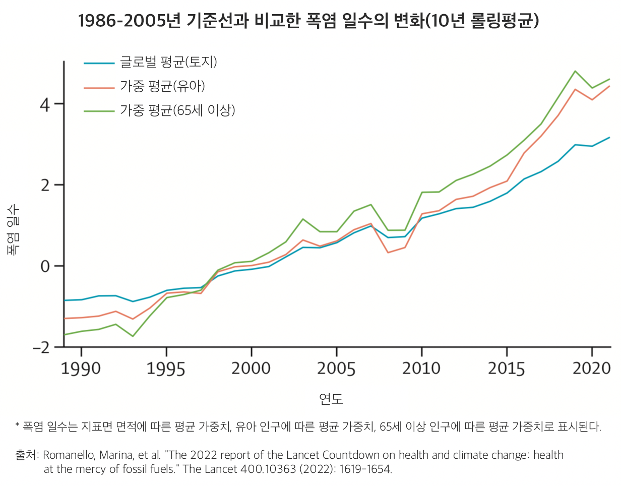 급속한 기온 상승으로 2021년 취약계층(65세 이상 성인, 1세 미만 아동)이 1986~2005년보다 37억 일 더 많은 폭염에 노출됐고, 2000~04년~2017~21년에는 열 관련 사망은 2000-04년과 2017-21년 사이에 68% 증가했으며, 사망자 수는 코로나19 팬데믹의 합류로 인해 크게 악화되었다.