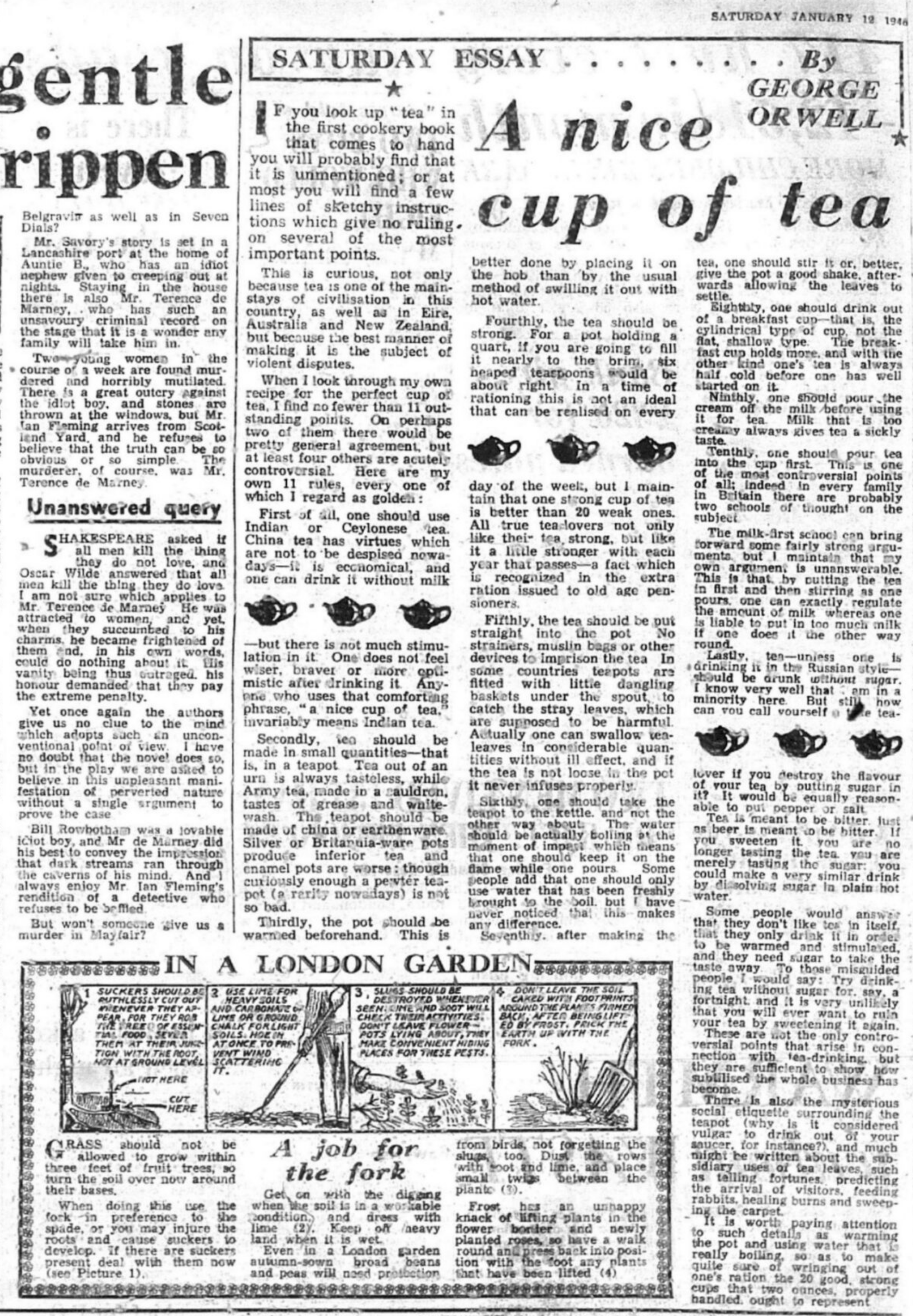 1946년 1월, 2차 대전의 여파로 아직 배급제가 있던 영국에서 조지 오웰 (George Orwell)은 차에 관한 에세이를 썼다. 오웰은 중국 차 대신 인도 차를 선호하거나, 찻주전자는 도자기가 좋으며, 차는 강해야 하며, 차를 먼저 따르고 우유는 나중에 따라야 하며, 설탕은 차의 맛을 빼앗는다는 등의 여러 규칙을 열거했다. 오웰의 이 에세이가 분명 멋진 차를 만들기 위한 왕도는 아니며, 그 스스로도 인정하듯 맛있는 차는 사람들의 취향에 따라 다를 수 있다. 가볍게 읽을 수 있는 차에 관한 그의 에세이는 차에 관한 반쯤 진지한 그리고 반쯤 우스개의 논쟁 아닌 논쟁을 불러일으켰다. 아래 글은 오웰의 이브닝 스탠더드, 1946년 1월 12일 자에 게재한 에세이 A Nice Cup of Tea의 번역으로 오웰은 여기서 생각하는 멋진 차를 만들기 위한 11가지 규칙을 제시하고 있다. 이 에세이는 차에 대한 에세이이자, 차를 통해 본 전후 영국에 대한 에세이이자, 차를 통해 본 영국 문화에 대한 에세이로 읽으면 더 재미있게 읽을 수 있다.