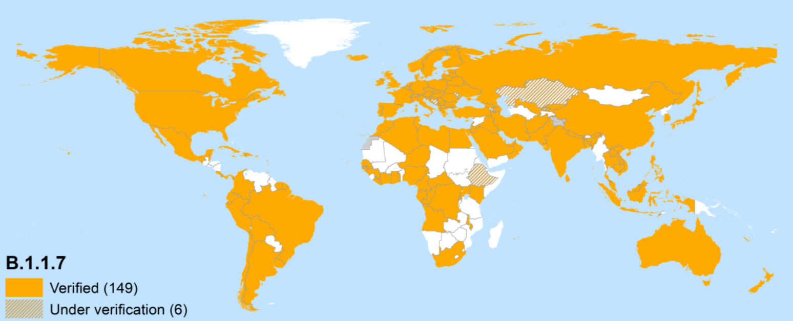 2021년 5월 25일 현재 영국/알파 변이(B.1.1.7)는 아래 지도와 같이 한국을 포함해 약 149개국에서 보고되었으며, 6개국에서 확인 중이다.