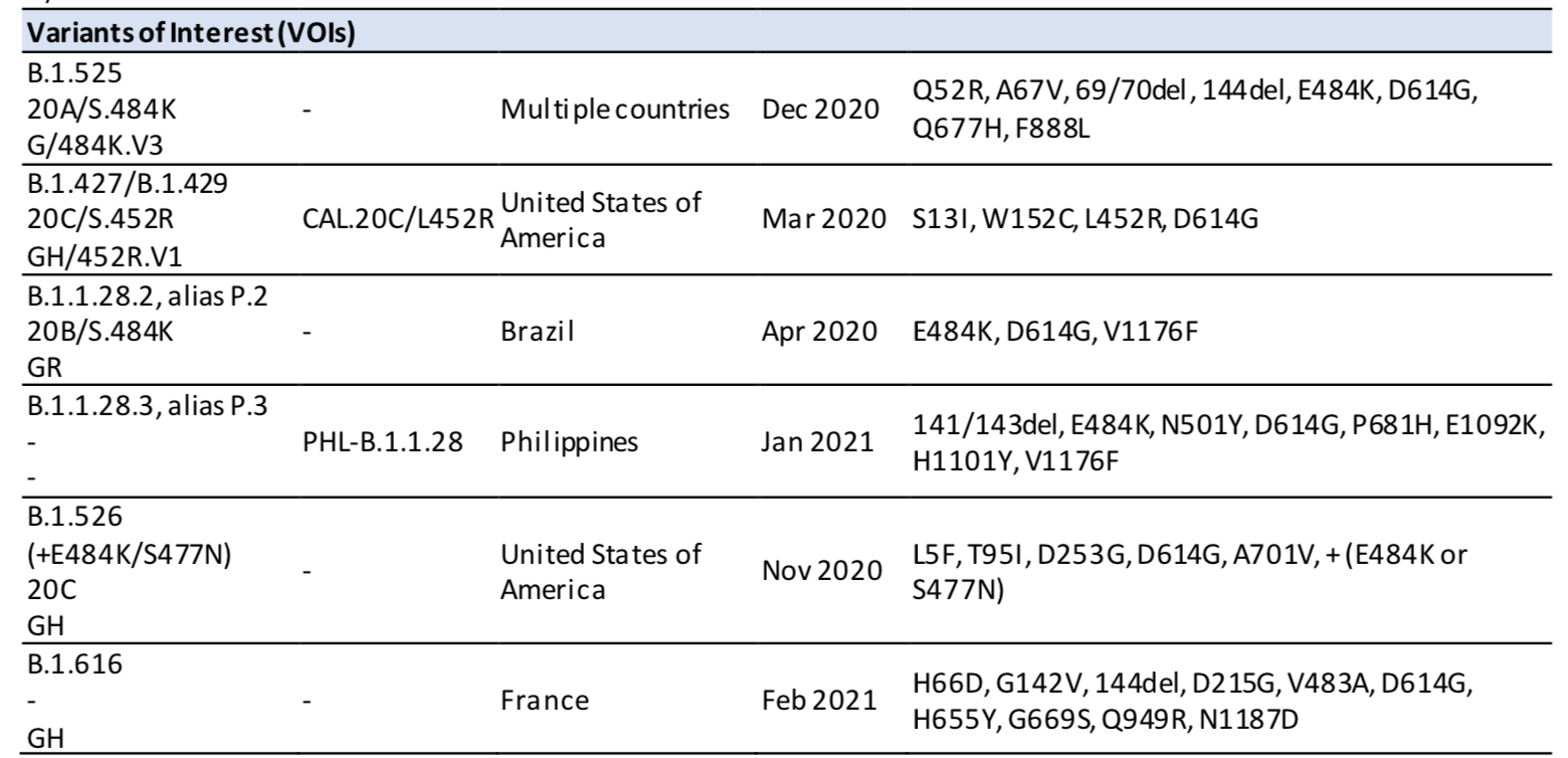 현재까지 WHO가 우려 변이(이하 VOC)로 등록한 변이는 영국/알파 변이(B.1.1.7), 남아프리카/베타 변이(B.1.351), 브라질/감마 변이(B.1.1.28.1, 일명 P.1), 그리고 인도/델타 변이(B.1.617) 4종이다.