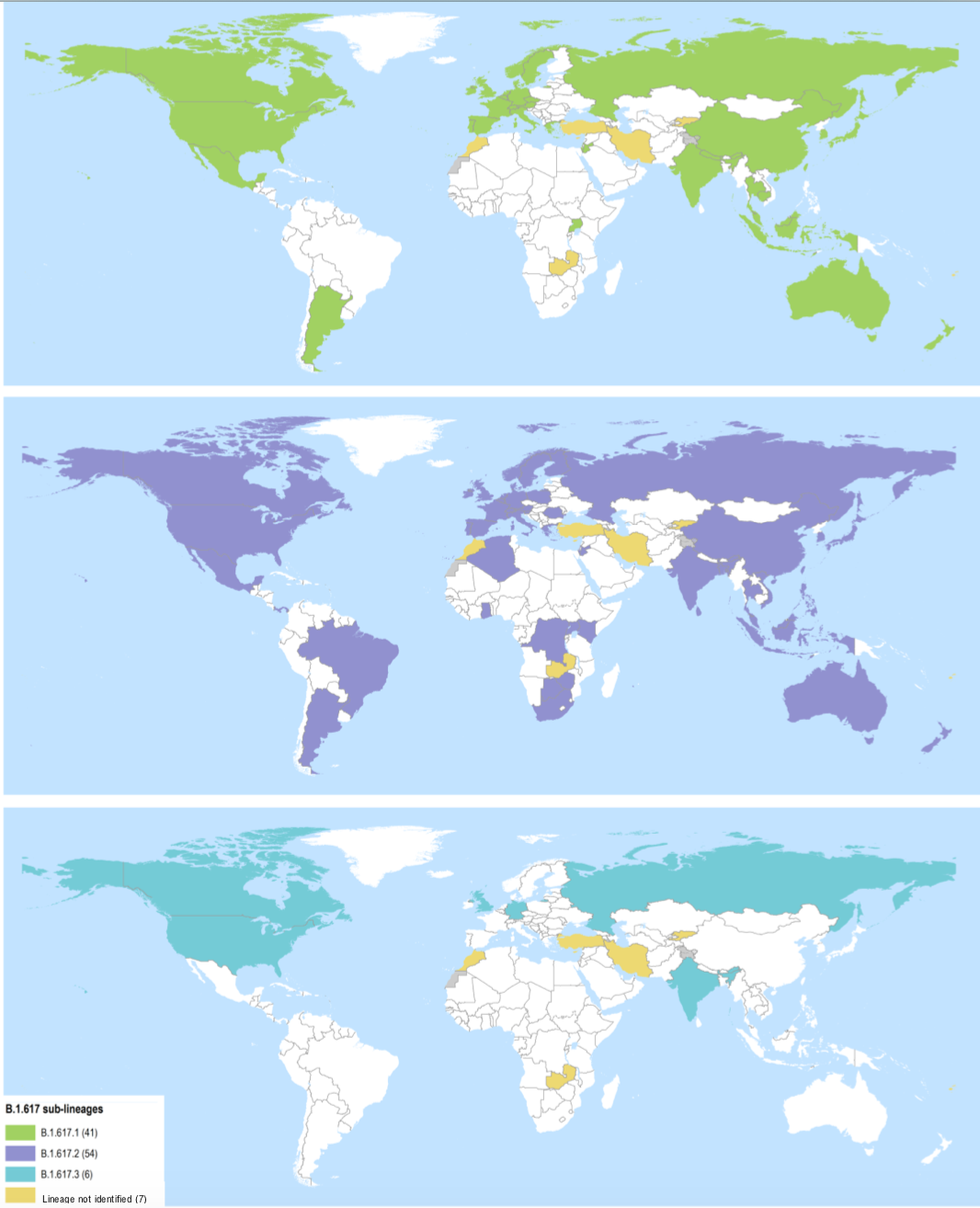 인도 변이(B.1.617)와 그 아계통을 살펴보면 B.1.617.1은 41개국, 델타 변이 B.1.617.2는 54개국, B.1.617.3은 6개국에서 확인되었다. 한국은 B.1.617.1과 B.1.617.2가 확인되었으며, B.1.617.3은 아직 보고되지 않았다.