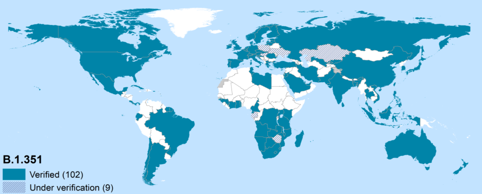 남아프리카/베타 변이(B.1.351)는 한국의 포함해 102개국에서 확인되었고, 현재 9개국에서 확인 중이다.