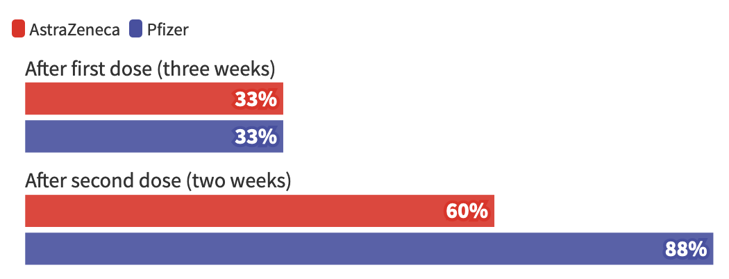 영국의 한 미발표 연구에 따르면, 화이자-바이오엔테크와 아스트라제네카 백신의 효과는 영국/알파 변이보다 인도 변이의 아계통인 델타 변이 B.1.617.2로 인한 증상 질환에서 약간 더 낮았다. 화이자-바이오엔테크 2회 투여의 백신 효과는 영국/알파 변이에 대해 93.4%였고 인도/델타 변이 B.1.617.2에 대해 87.9%였다. 아스트라제네카 2회 용량의 백신 효과는 영국/알파 변이에 대해 66.1%, 인도/델타 변이 B.1.617.2에 대해 59.8%였다. 델타 변이 B.1.617.2에 대한 두 백신의 2회 접종 후 효과는 영국/알파 변이나 non-VOC보다 약간 떨어지지만 모두 뛰어난 효과를 유지했다.