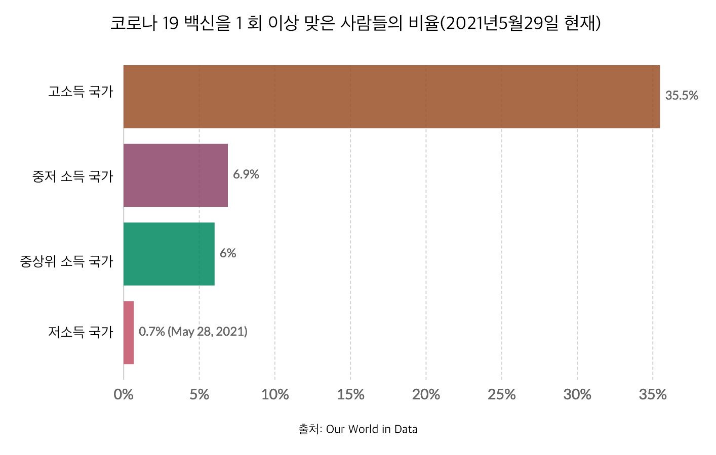 지난 3월 《내츄어》(nature)지에는 '코로나 집단면역이 아마도 불가능한 5가지 이유'란 글이 실렸다. 그 글에 따르면 집단면역이 아마도 불가능한 중요한 하나의 이유는 백신 불평등 때문이다. 이스라엘은 이미 전체 인구의 59.3%가 백신을 2회 접종까지 마쳤지만, 아프리카 국가들의 대부분은 0.1%도 되지 않는다. 아래 차트가 보여주듯 고소득국가 인구의 35.3%가 1회 이상 백신 주사를 맞았지만, 저소득 국가는 인구의 0.6%만이 1회 접종을 받았을 뿐이다.