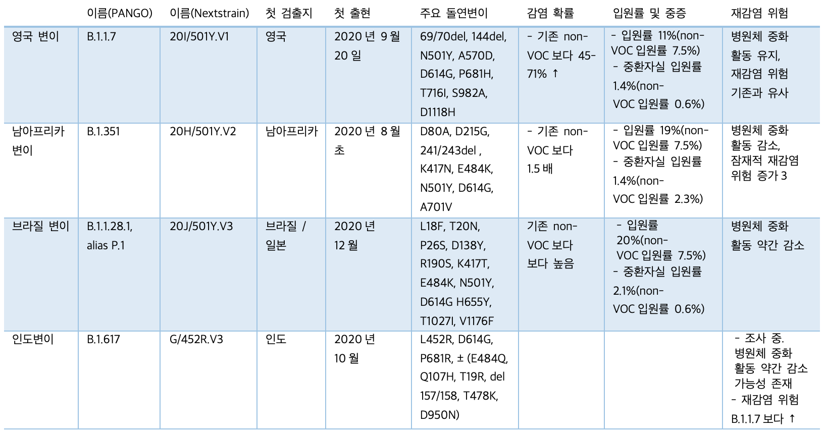 영국/알파, 남아프리카/베타, 브라질/감마 변이에 대한 연구들은 아직 진행 중이며, 연구마다 감염력, 입원율, 중증화, 2차 발병 혹은 재감염에 대한 결과가 다 조금씩 다르며, 계속 업데이트되고 있어서 이 VOC의 위험을 정확히 특정할 수는 없다. 하지만 대체적인 특징은 WHO가 계속 업데이트하는 자료에서 확인 가능하다. 아래 도표에 정리한 것처럼 VOC는 기존의 오리지널 코로나 19 바이러스 즉 non-VOC보다 감염력, 입원율과 중증화, 재감염률 모두 높다. 인도/델타 변이에 대한 연구는 최근 VOC로 등록돼 아직 미진한 형편이다.