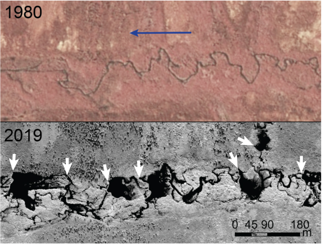 이 이미지는 비버가 알래스카 수어드(Seward) 반도의 나무 경계선 근처에 있는 툰드라 개울을 어떻게 변형시켰는지 보여준다. 파란색 화살표는 하천 흐름의 방향을 나타낸다. 2019년 위성 이미지의 검은 연못은 흰색 화살표로 표시된 하류 끝의 비버 댐에 의해 생성되었다. 출처: K.D. TAPE ET AL / SCIENTIFIC REPORTS 2022