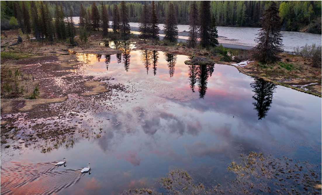 한 쌍의 백조가 알래스카 산맥의 출리트나 강(Chulitna River)에 있는 비버 연못을 활공한다. 툰드라 남쪽의 전통적인 비버 서식지에서 비버 댐은 버드나무, 개구리, 물새 및 명금류를 포함한 다양한 유기체를 위한 서식지를 만든다. 연구자들은 비버가 툰드라 생태계에 미치는 영향을 연구하고 있다. 사진: KEN TAPE