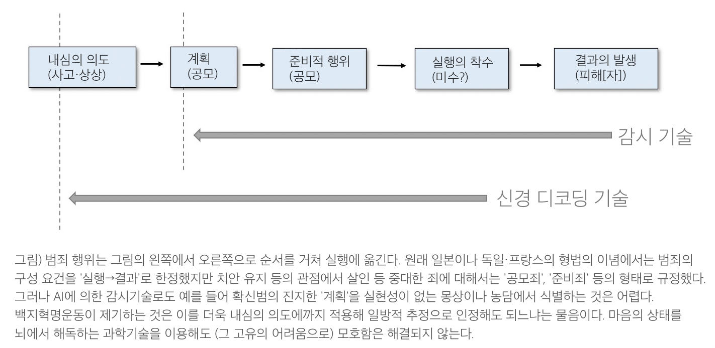 바로 근미래형 디스토피아다. 이러한 기술은 '실제의 행동에 한정한다'는 형법의 큰 전제를 더욱 무너뜨린다. 게다가 순수하게 과학적으로 보더라도 실행되지 않은 '범죄 의도' 판정은 원리적으로 어렵다. 신경과학의 최신 지견에 따르면 근육 운동 그 자체는 대뇌의 운동 피질에서 기록되는 '운동 준비 전위'(運動準備電位)로부터 확실하게 예측할 수 있다. 그러나 보다 추상적인 행위의 의도(예를 들어 어떤 사람을 죽이고 싶다)가 되면 훨씬 복잡하고 모호해 신경활동만으로는 예측할 수 없다. 게다가 '의도'는 대개 '후속적으로 재구성'되어야 비로소 형태를 갖추는데, 즉 자신의 행동과 결과를 보고 나중에 추정되고 실감된다(Shimojo, Frontiers in Psychology, 2014). 잠재적인 의도와 현재적인 의도, 욕구와 트리거(직접적인 방아쇠) 등이 식별되어야 하며, 점점 책임 소재를 모호하게 한다.