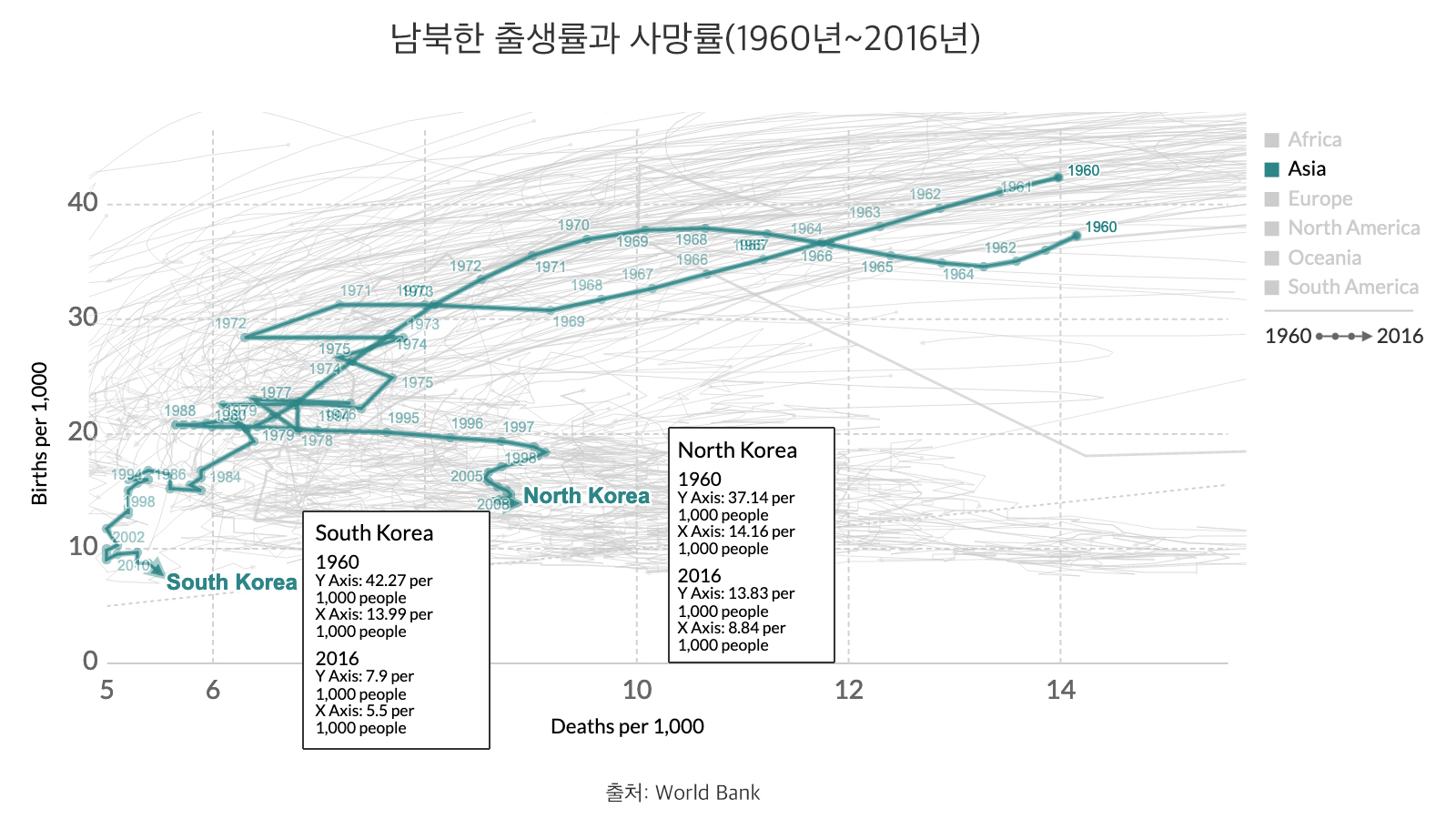 아래 차트는 1960년~2016년 사이 남북한의 출생률과 사망률 변화를 보여준다. 세로축은 1천 명당 출생률, 가로축은 1천 명 당 사망률을 표시한다. 1960년 한국의 출생률은 1천 명당 42.27명, 사망률은 13.99명이었다. 2016년 사망률과 출생률은 각각 7.9 명과 5.5 명으로 감소했다. 북한은 1960년 출생률 37.14명, 사망률 14.16명에서 2016년 각각 13.83명과 8.84 명으로 감소했다.