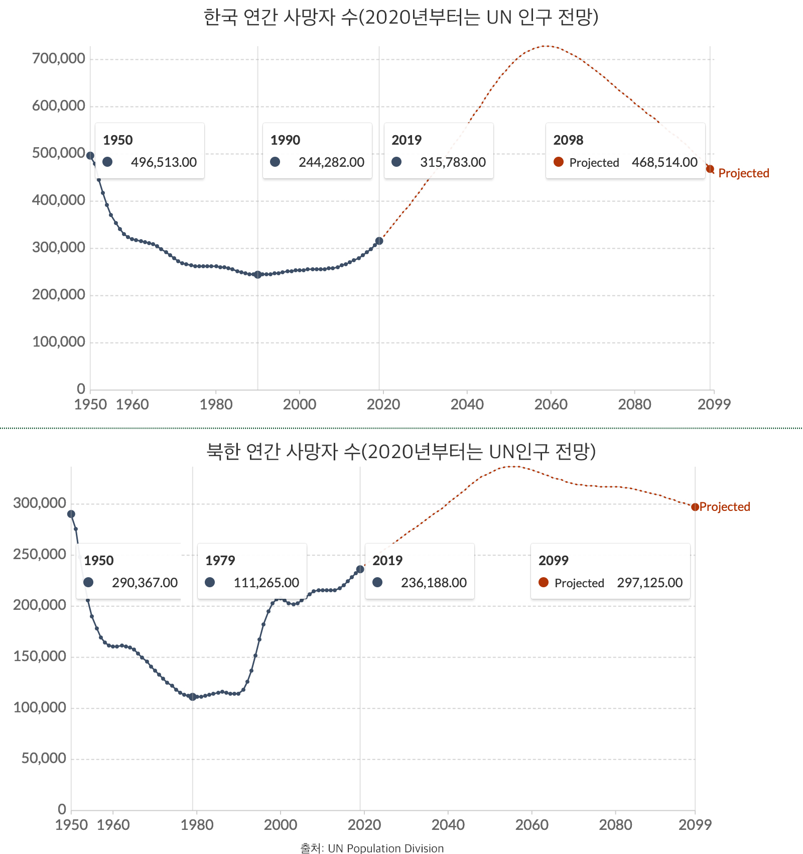 한국의 연간 사망자 수는 한국전쟁이 발발한 1950년 49만 명으로 최고를 기록했고, 1990년 24만 명 수준까지 감소했다. 이후 지속해서 증가하기 시작한 사망자 수는 2019년 31만 명에 이르렀다. 북한의 사망자 수는 1950년의 29만 명이 가장 많았으며, 1979년 11만 명으로 최저를 기록했다. 북한은 1980년대 말 동유럽 붕괴 이후 사망자 수가 증가하기 시작해 1990년대 중반 이후 수해와 기아로 사망자가 급증했다. 2006년 수해 그리고 최근 지속적인 대북제재로 인한 고립은 북한의 사망자 수 증가와 무관하지 않다.