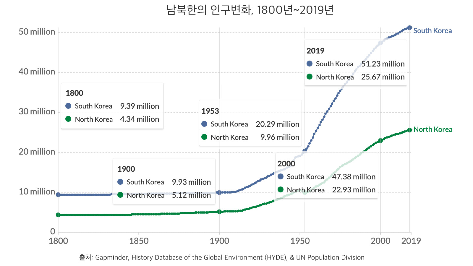 세계 인구는 1800년 10억 명에서 오늘날 77억 명으로 증가했다. 같은 기간 한국의 인구는 939만 명에서 5,123만 명으로, 북한 인구는 434만 명에서 2,567만 명으로 증가했다. 1800년과 비교하면 양적으로 남북한 간의 차이는 벌어졌지만, 비율로 보면 남북한의 차이는 오히려 줄었다. 당시 북한의 인구는 남한 인구의 46%였지만 2019년 현재 북한 인구는 한국 인구의 50%를 약간 넘는다. 한국의 인구는 지속해서 성장했고, 북한 인구는 한국전쟁 기간인 1950년~1953년 사이 1,055만 명 997만 명으로 감소한 기간이 존재했다.