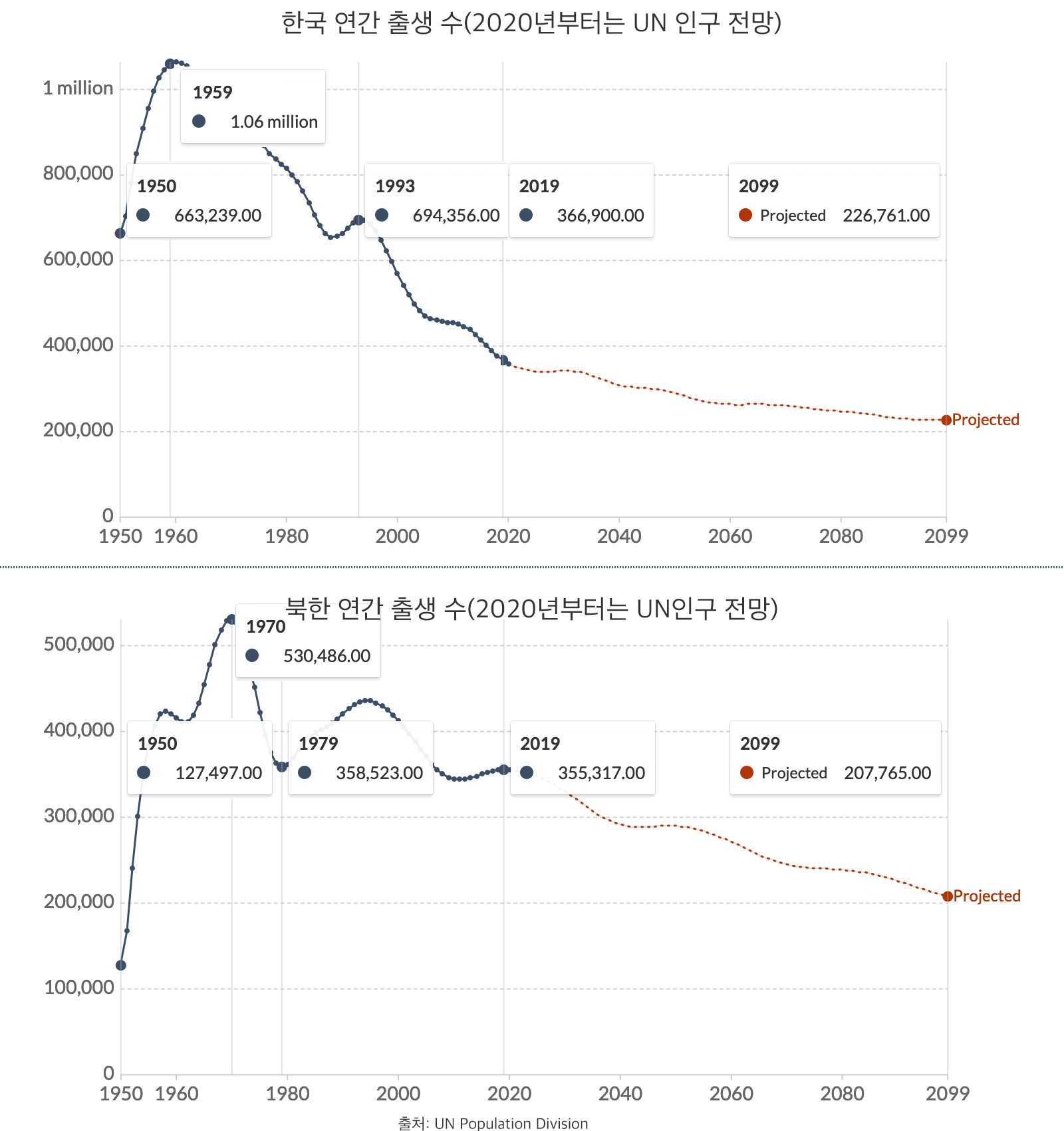 한국은 1950년 약 66만 명이 출생했고, 1959년 106만 명이 출생해 전후 최고를 기록했다. 이후 지속해서 감소하던 출생자 수는 1993년 69만 명으로 상승했다가 2019년 36만 명으로 감소했다. 1950년 출생자 수와 비교하면 거의 반으로 준 셈이다. 북한은 1950년 12만 명이 출생하고 북한이 1972년 오일 쇼크로 경제 침체에 빠지기 직전인 1970년 53만 명 출생으로 최고를 기록했다. 2019년 현재 북한의 연간 출생자 수는 약 35만 명이다. 남북한의 연간 출생자 수는 UN에 따르면 2099년에는 한국이 22만 명, 북한이 20만 명으로 거의 같은 수준에 도달할 전망이다.
