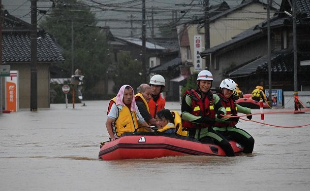 폭우 피해 주민 고무보트 구출 소방대원들. 2022년 8월 4일 이시카와현 고마쓰시. 사진: マハール有仁州