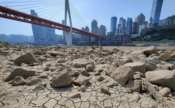 강바닥이 드러나 가뭄으로 땅이 갈라진 장강 지류 가릉강. 2022년 8월 25일 중국 충칭시. 사진 朝日新聞