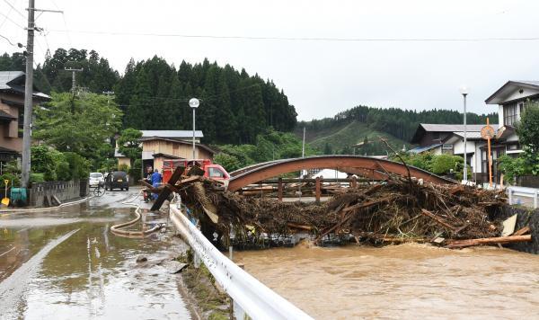확대 범람한 우치가와 강. 일본을 비롯해 전 세계에서 홍수와 범람이 잇따르고 있다. 2022년 8월, 아키타현 고죠메초. 사진: 朝日新聞