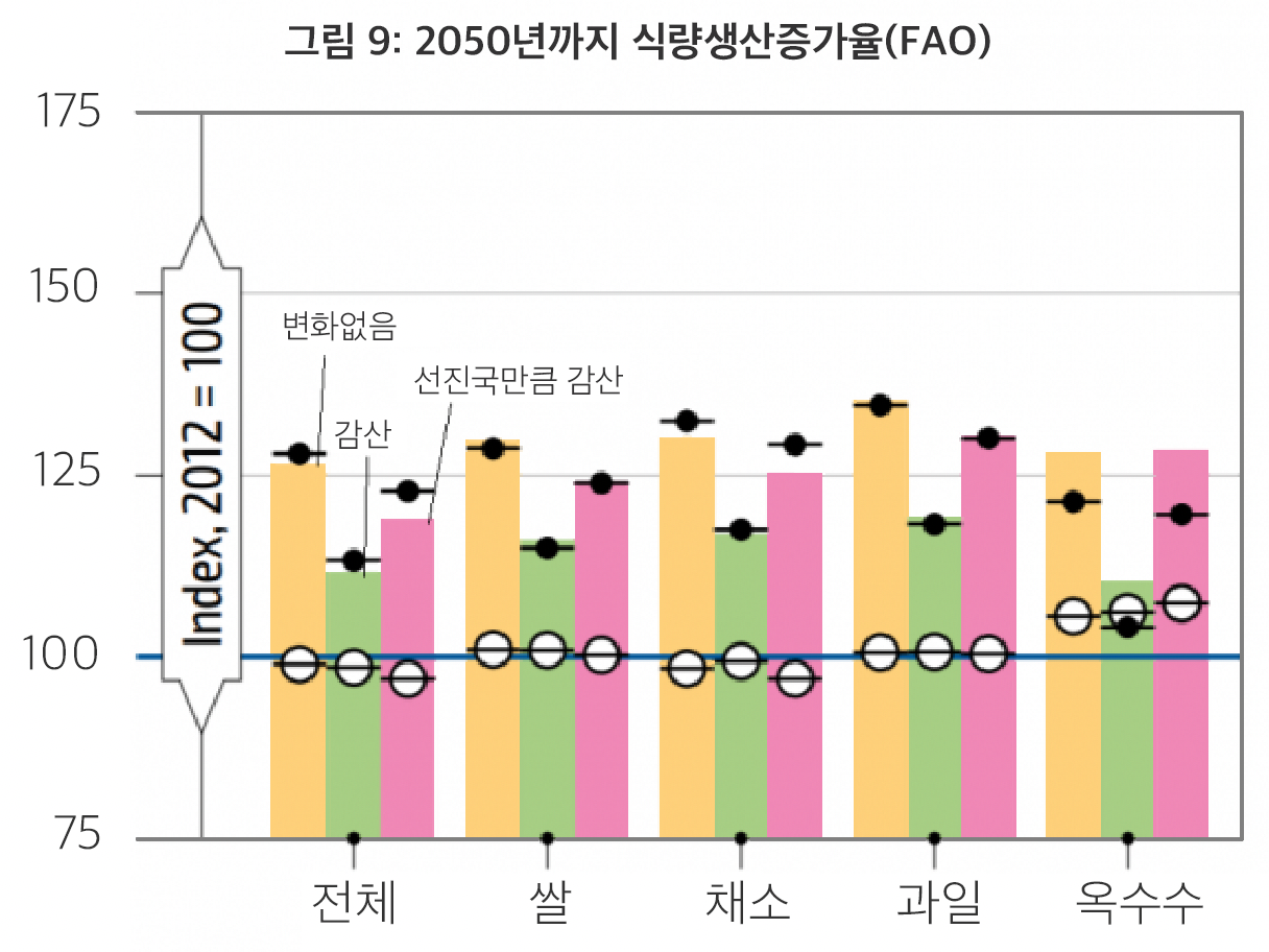 늘어난다. 유엔농업기구(FAO) 시나리오에 따르면 2050년 세계 식량 생산은 아무것도 하지 않으면 지금보다 25% 늘어나지만 축산에서 온실가스의 15%가 나오고 있기 때문에 그것을 줄이면 증가율이 12%로 낮아진다.