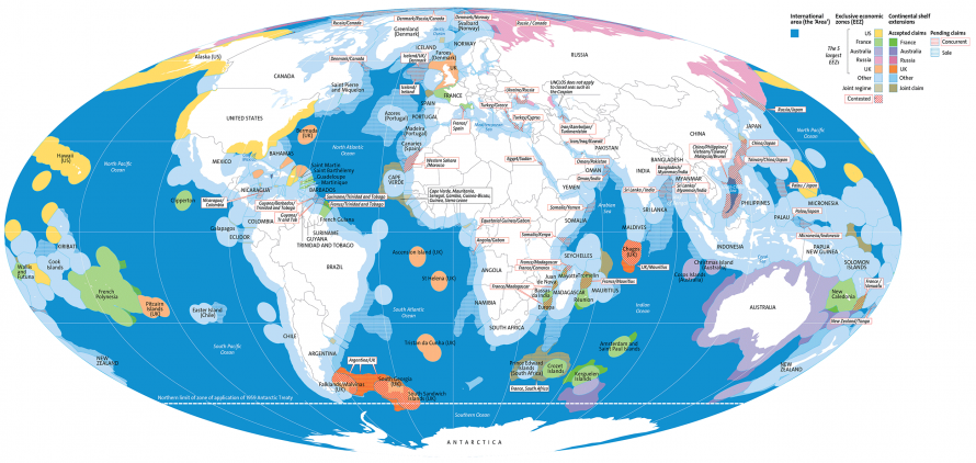 UNCLOS의 이행이 채택된 지(작성 당시와 근본적으로 다른 지정학적 맥락에서) 40년이 지난 지금도 이행이 추진되고 있다는 사실은 주권 행사가 핵심 이슈라는 점에서 기적과도 같다. EEZ 개념은 역사상 주 관할권의 가장 큰 지리적 확장을 초래했다. 이러한 구역은 현재 전 세계 바다의 40%를 차지하고 있으며, 약 30개 국가에서 100만 평방 킬로미터 이상의 EEZ를 보유하고 있다. 어떤 경우에는 EEZ가 200nm를 초과할 수 있다. 확장된 대륙붕 메커니즘(저와 그 하층토에만 관련됨) 하에서, 그것들이 특정 지질학적 기준을 만족한다면 해안으로부터 350nm까지 확장될 수 있고, 2,500m 등심선(等深線, isobath)을 (2) 초과하는 100nm까지 확장될 수 있다.
