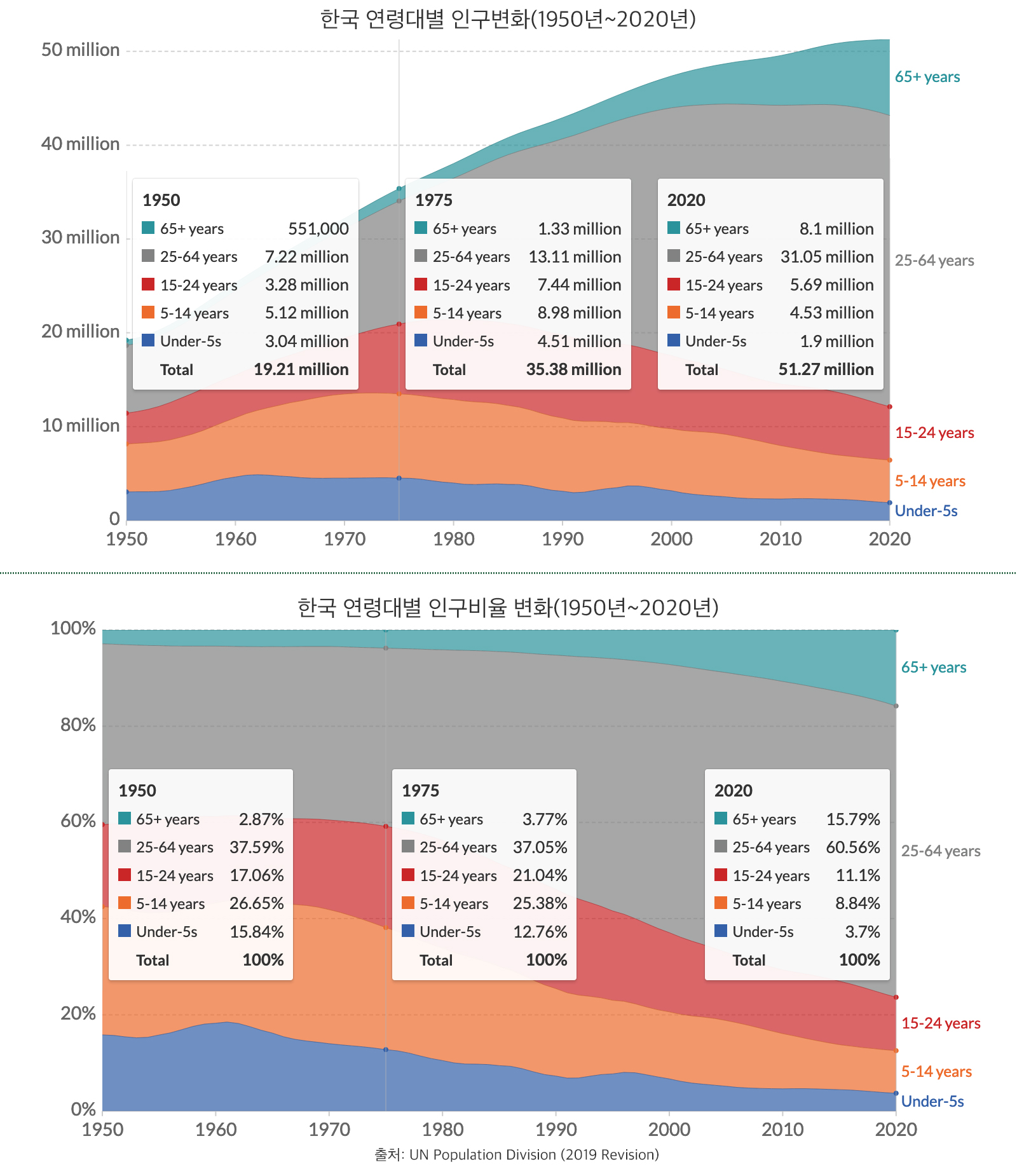 인구의 연령 구조는 경제 성장률, 노동력 참여, 교육 및 의료 서비스, 주택 시장 등 사회의 다양한 측면에 큰 영향을 미친다. 1950년 한국 인구구조는 65세 이상이 55만 명(2.87%), 25세~64세 722만 명(37.59%), 15세~24세 328만 명(17.06%), 5세~14세 512만 명(26.65%), 5세 미만 304만 명(15.84%)였다. 이 인구구조는 2020년 65세 이상이 810만 명(15.79%), 25세~64세 3,105만 명(60.56%), 15세~24세 569만 명(11.1%), 5세~14세 453만 명(8.84%), 5세 미만 190만 명(3.7%)으로 크게 변화했다. 이 기간에 65세 이상은 1,369% 증가, 25세~64세는 330% 증가, 15세~24세는 74% 증가, 5세~14세는 11% 감소, 5세 미만 38% 감소했다. 한국 인구가 1950년 1,921만 명에서 2020년 5,127만 명으로 증가했다는 사실을 염두에 두면 거대한 변화다. 25세 미만 인구는 전체 인구에서 1950년 약 60%를 차지했지만 2020년 23.64%로 감소했으며, 15세 미만의 경우는 42.29%에서 2020년 12.54%로 대폭 축소됐다. 65세 이상 인구가 차지하는 비율은 1950년 전체 인구에서 불과 2.87%였지만 2020년 15.79%로 5배 이상 커졌다.