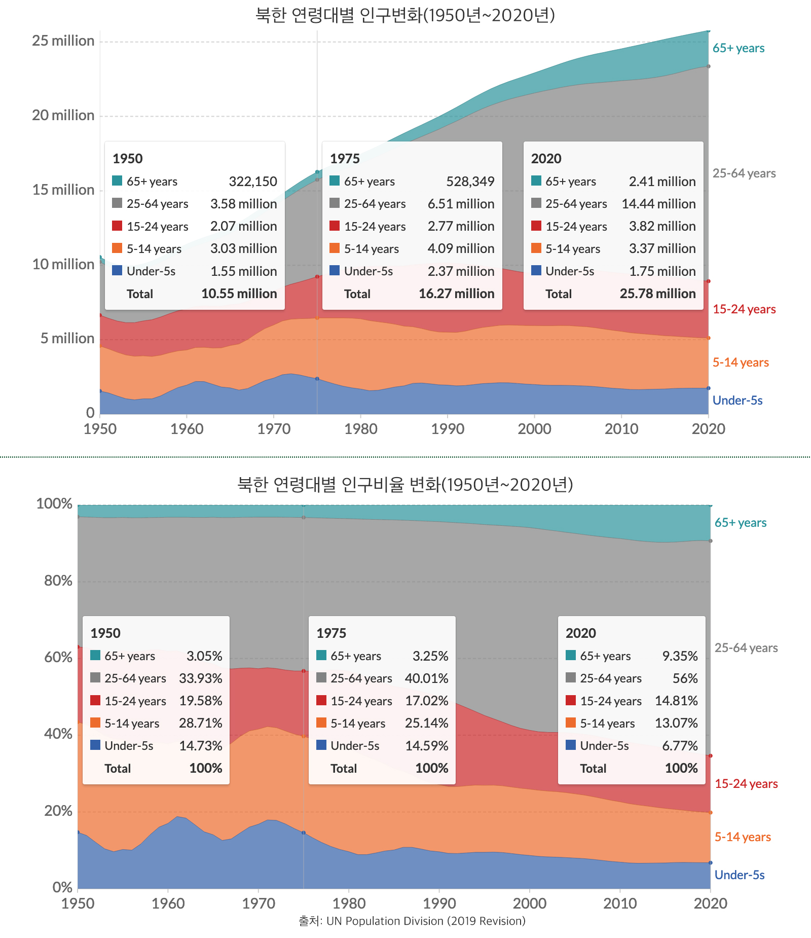1950년 북한 인구구조는 65세 이상이 32만 명(3.05%), 25세~64세 358만 명(33.93%), 15세~24세 207만 명(19.58%), 5세~14세 303만 명(28.71%), 5세 미만 155만 명(14.73%)였다. 이 인구구조는 2020년 65세 이상이 241만 명(9.35%), 25세~64세 1,444만 명(56%), 15세~24세 382만 명(14.81%), 5세~14세 337만 명(13.07%), 5세 미만 175만 명(6.77%)으로 변화했다. 이 기간에 65세 이상은 1,369% 증가, 25세~64세는 330% 증가, 15세~24세는 74% 증가, 5세~14세는 11% 감소, 5세 미만 38% 감소했다. 북한은 1950년 1,055만 명에서 2020년 2,577만 명으로 증가했다. 이 기간에 65세 이상은 648% 증가, 25세~64세는 303% 증가, 15세~24세는 85% 증가, 5세~14세는 11% 증가, 5세 미만은 12%가 증가했다. 하지만 전체 인구 구조로 보면 25세 미만 인구가 전체 인구에서 차지하는 비율은 1950년 62.97%에서 2020년 34.65%로 축소됐으며, 15세 미만의 경우는 같은 기간 43.44%에서 2020년 19.84%로 감소했다.