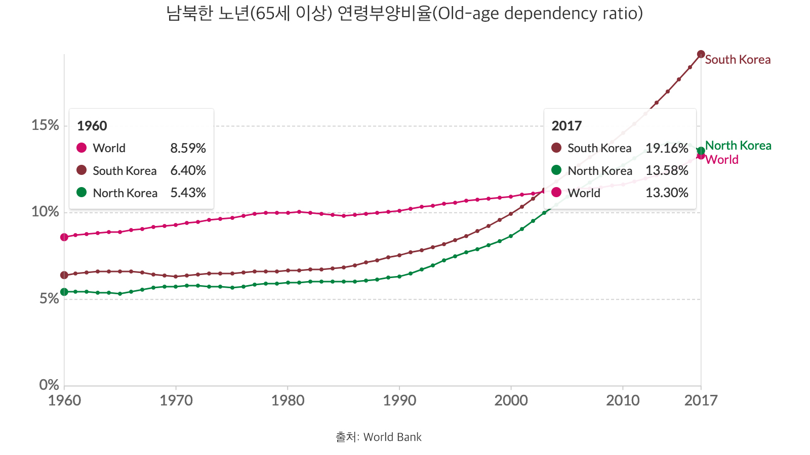 남북한 노동연령층의 노년연령부양비율은 1960년 한국 6.40%, 북한 5.43%에서 2017년 한국 19.16%, 북한 13.56%로 변화했다. 한국의 노년연령부양비율 상승 폭은 200%로 국가별로 보면 일본(414%), 싱가포르(380%), 보스니아헤르체고비나(307%)에 이어 세계에서 4번째로 높은 상승 폭이다. 그만큼 노동연령이 부양해야 하는 노년층이 증가했다는 의미이다.
