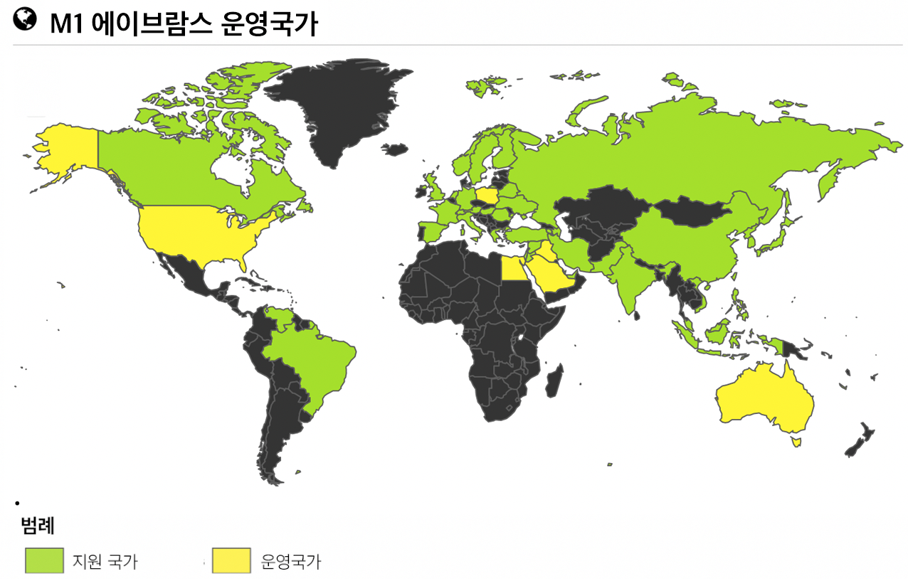 미국의 M1 에이브럼스는 화려한 전적을 가지고 있다. 에이브럼스는 제1차 걸프전 사막 폭풍 작전 기간 동안, 1,848대가 이라크에 배치되었고 23대만이 전투에서 철수했다. 이들은 주로 경미한 피해를 입었고, 적군에 의해 한대도 파괴되지 않았으며, 탱크 승무원도 사망하지 않았다. 제2차 걸프전에서 에이브람스는 사담 후세인을 물리친 기갑군을 이끌었다. 22003년 나시리야 인근 유프라테스강 다리에서 해병대 에이브람스가 추락해 승무원 4명이 익사했지만, M1 에이브람스는 여러 차례 완벽하게 전투를 수행했다. 에이브럼스는 7년마다 주요 업그레이드를 했으며 탱크의 모든 시스템은 1980년에 시작된 이래로 교체되었다. 최신 M1A2 SEPv3는 장갑, 통신, 연료 절감을 개선하여 전차의 기동성과 생존성을 향상했다.