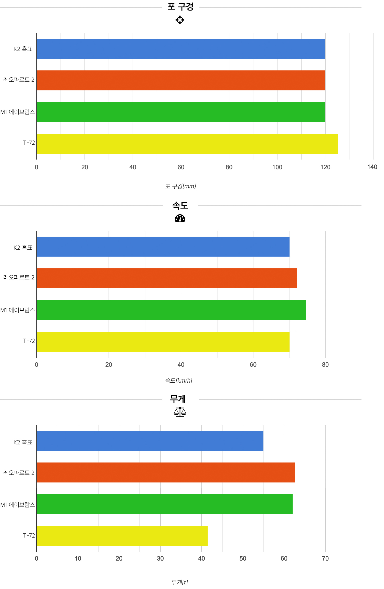 무게: | 55톤 | 55.15 - 62.5 톤 | 62톤(M1A2) | 41.5톤 |