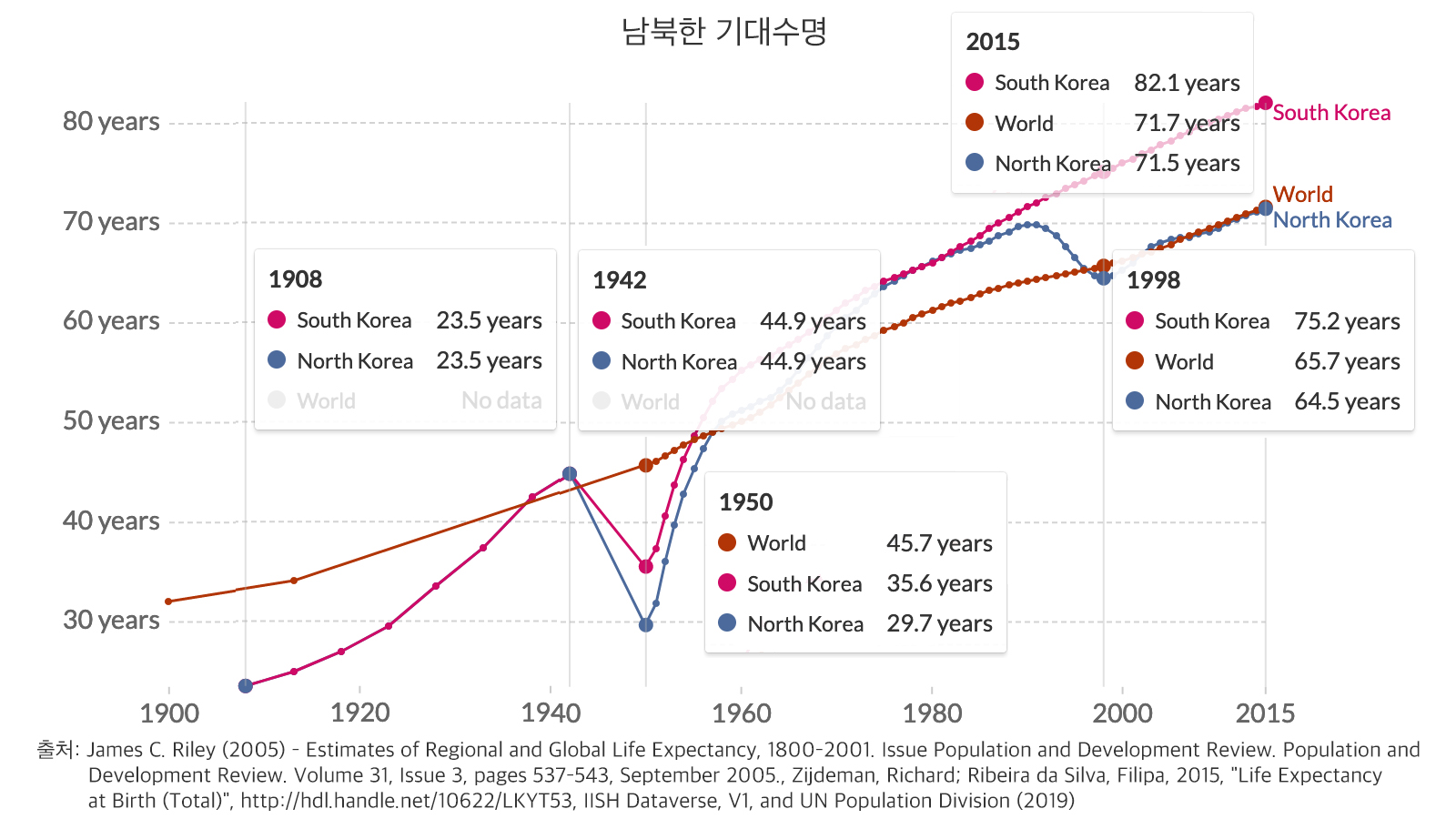 국가 간 기대수명 차이가 크다는 사실 외에도 분명한 것은 1950년 이후 인류는 건강과 수명을 제한하는 여러 한계의 봉인을 깼다는 것이다. 유엔은 2019년 세계 평균 수명을 72.6 년으로 추정한다. 이는 1950년 기대수명이 가장 높았던 노르웨이의 72.3년보다 오늘날 세계 평균 기대수명이 높다는 것을 의미한다. 오늘날의 인류는 1770년의 인류보다 최소한 두 배 혹은 세 배 이상 더 오래 산다. 과연 이러한 변화는 남북한에는 어떻게 나타났을까?