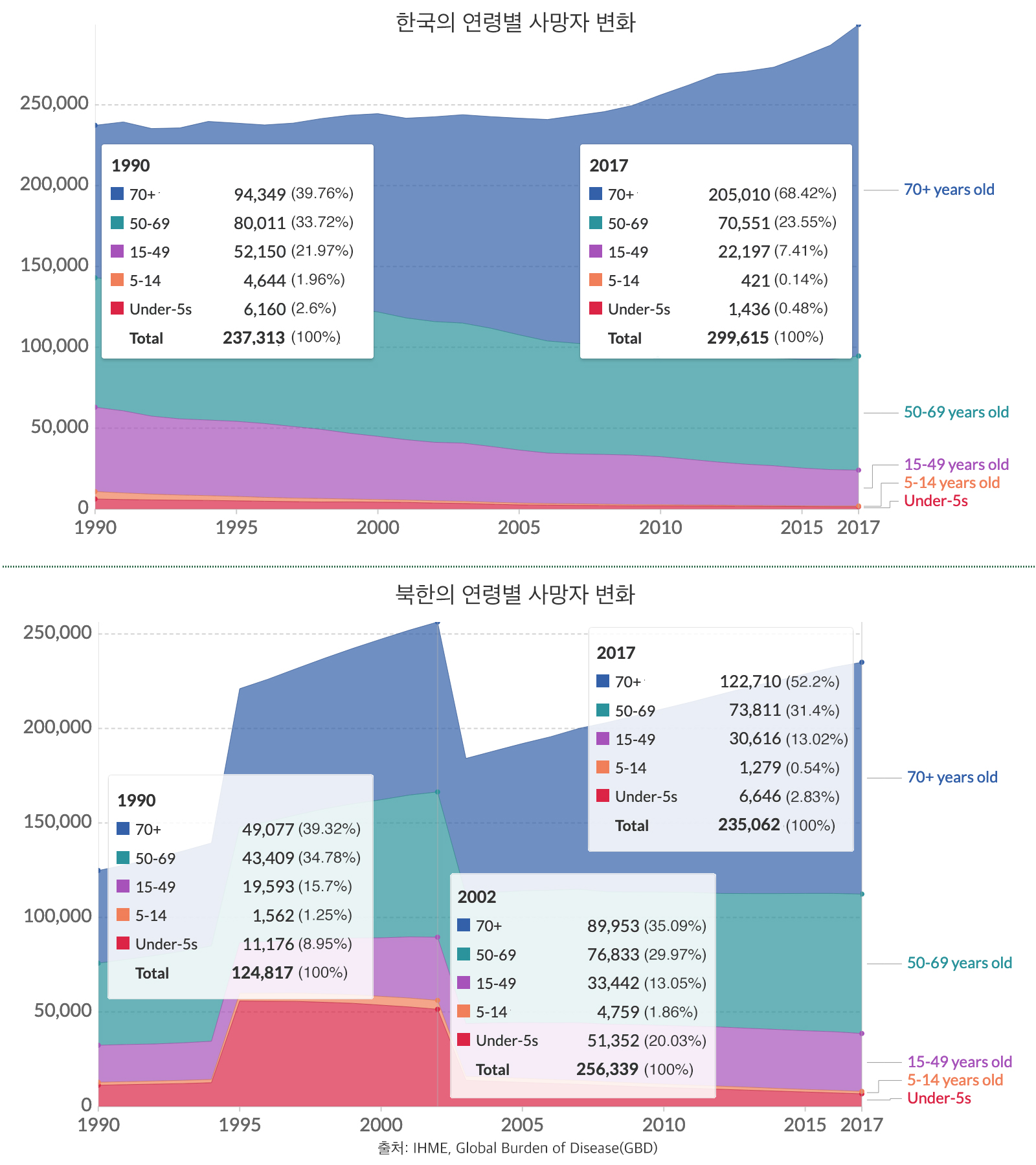 북한의 1990년 전체 사망자의 약 40%는 70세 이상이었다. 이 비율은 2017년 52%로 증가했다. 5세 미만의 사망자는 약 9%에서 2.8%로 감소했다. 위에서 살펴본 바와 같이 북한은 1990년대 중반부터 2000년대 초반까지 경제난, 수해와 기아 등으로 전반적인 공중보건 위기를 겪었다. 사망자 수가 약 25만 명으로 최고조에 이르렀던 2002년 5세 미만 아동의 사망률은 무려 20%에 이르렀다. 이 공중보건의 위기는 2002년 이후 해소되었지만, 북한은 여전히 이 공중보건 위기의 후유증에서 회복하는 중이다.