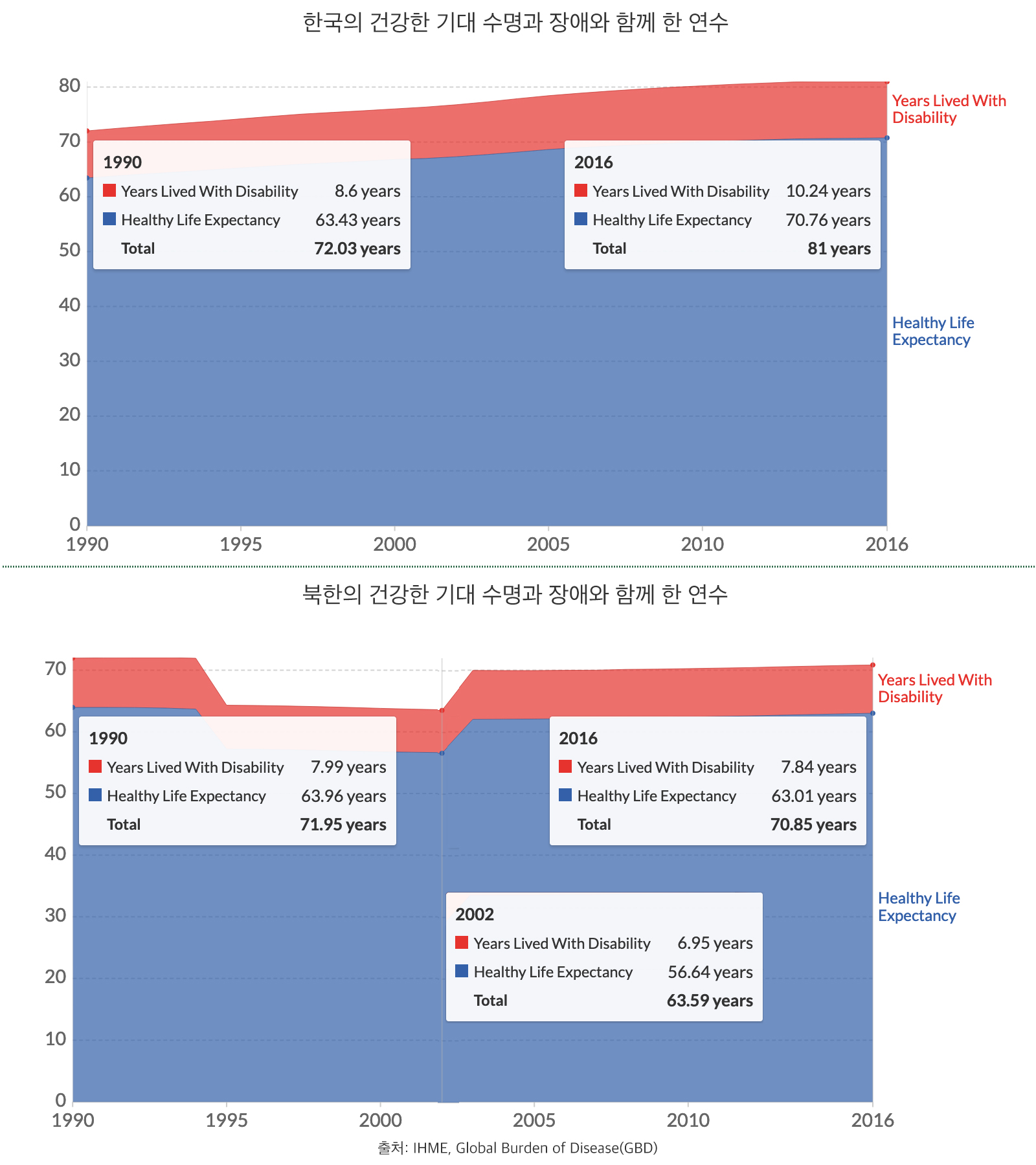 한국의 기대수명은 1990년~2016년 사이 72.03세에서 81세로 증가했고 그 중 '건강한 기대 수명'과 '장애와 함께 산 연수'는 63.43세와 8.6세에서 각각 70.76세에서 10.24세로 증가했으며, 고소득국가 유형과 비슷한 패턴을 보였다. 북한은 같은 기간 기대수명은 71.95세에서 70.85세로 줄었으며, '건강한 기대 수명'과 '장애와 함께 산 연수' 역시 63.96세와 7.99세에서 63.01세와 7.84세로 줄었다. 이는 앞서 언급했던 공중보건 위기와 관련이 있다. 북한의 2002년 기대수명 65.59세와 '건강한 기대 수명'과 '장애와 함께 산 연수' 56.64세, 6.95세는 이 위기의 심각성을, 그리고 2016년 기대수명과 '건강한 기대 수명'과 '장애와 함께 산 연수'의 감소는 그 후유증을 보여준다.