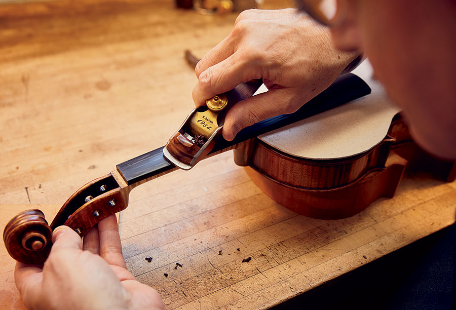 베커는 평가하는 데 몇 초 밖에 걸리지 않는다. 그런 다음 주름진 셔츠를 가로질러 철이 미끄러지는 것과 같은 동작으로 지판을 가로질러 대패를 앞뒤로 미끄러지듯 작업을 시작한다. 작은 흑단 부스러기가 악기 주위에 모이기 시작한다. 베커는 보드를 재측정하기 위해 가끔 멈춘다. 그는 현이 윙윙거리는 소리를 내지 않도록 딱 맞아야 하는 모양에 만족할 때까지 다듬기를 계속한다.