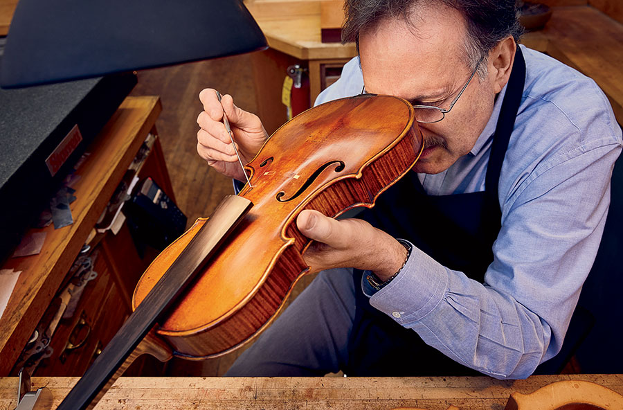벨과 에네스의 방문 일주일 전인 8월 초, 베커는 그의 두 명의 현악기 제작자인 다케시 노가와(Takeshi Nogawa)와 케이스케 호리(Keisuke Hori) 사이에 앉아 있다. 팔뚝을 걷어붙인 채 호리는 의학용 현미경 아래 얇은 나무토막을 들고 있다. 사실, 그것은 18세기에 과르네리 델 게슈의 아버지가 만든 바이올린의 상단이다. (과르네리 가문의 3대가 바이올린을 만들었다.) 등, 갈비뼈, 목 등의 나머지 조각들은 몇 인치 떨어진 곳에 놓여 있다.