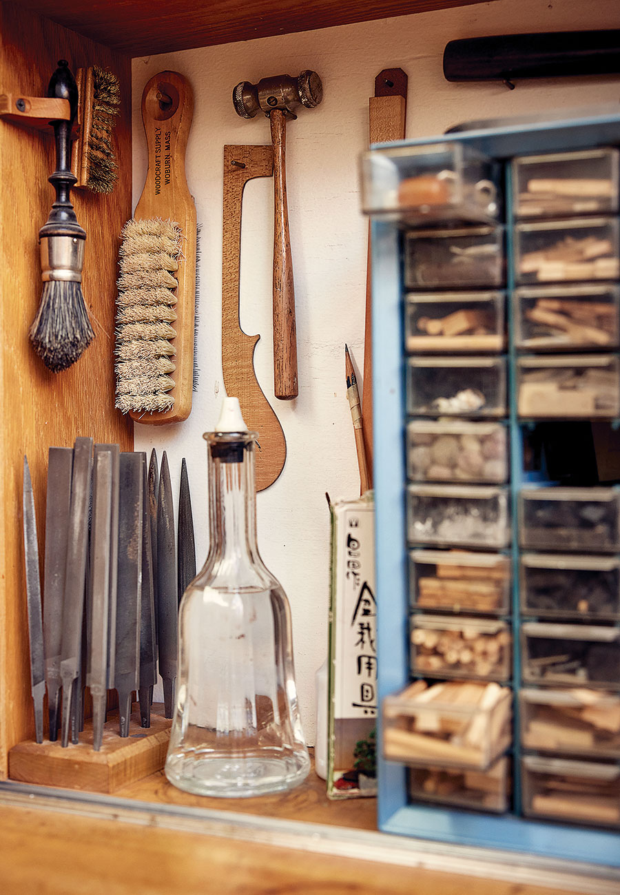 요즘, 베커의 많은 수술 도구들이 그의 책상 위에 있는 두 개의 작은 공간을 채운다. 한 선반에는 말의 부속으로 만들어진 접착제 병이 놓여 있다. 베커는 대부분의 고급 현악기 제작자와 마찬가지로 수용성이기 때문에 아교를 선호하는데, 이는 이전 수리를 더 쉽게 재작업할 수 있고 탄성이 있어 시간이 지남에 따라 목재와 함께 팽창 및 수축할 수 있기 때문이다. 또 다른 선반에는 베커가 수집한 장치들이 줄지어 있다. 그의 19세기 조각 도구와 같은 것들은 그가 골동품 시장에서 발견했다. 다른 것들은, 미술품 파일들과 같이, 프랑스에서 왔다. 또 다른 것들은 그의 필요에 맞게 맞춤 제작되었다.