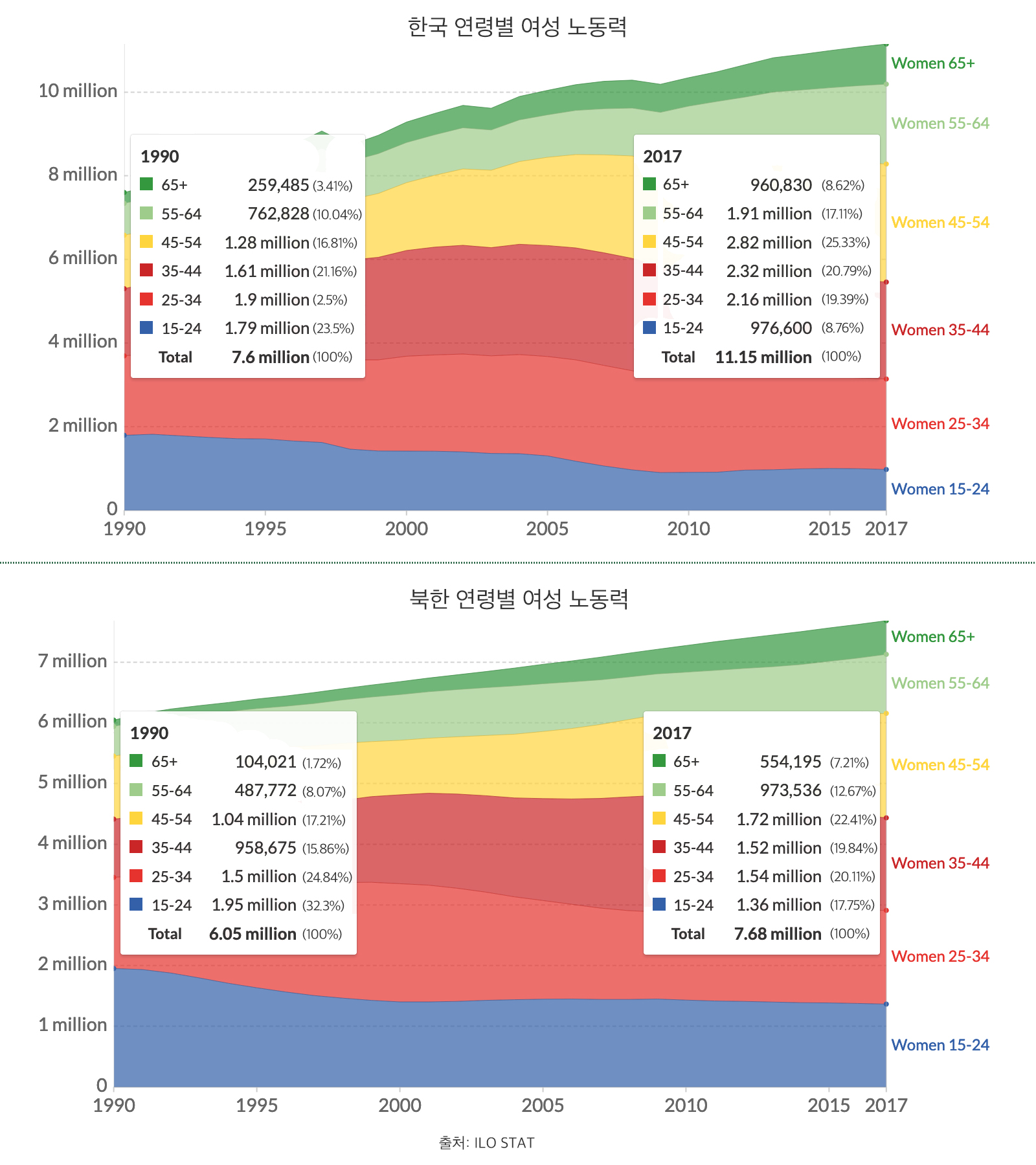 아래 그래프는 남북한 여성들의 연령별 경제활동 인구를 보여준다. 한국은 ₩997년~1998년 금융위기 이후 여성의 노동시장 참여가 감소했지만, 그 이후 지속해서 증가해 약 4백만 명이 증가했다. 특히 비정규직의 확산과 고용 불안정, 서비스 부문의 확장으로 45세 이후 여성들의 전체 여성 경제활동에서 차지하는 비율이 1990년 30%에서 50%로 큰 폭으로 증가했다. 특히 45세~54세 연령층의 경제활동은 약 10% 정도 상승했다. 여성 경제활동의 중심연령층이 비율로 보면 한국은 25세~34세에서 45세~54세로 이동했다.