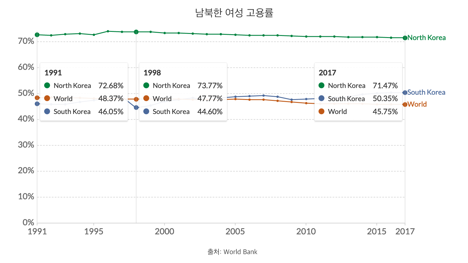 여성의 노동시장 참여 증가는 노동시간 감소와 함께 이루어졌다. 그 때문에 여성들이 직장에서 보내는 평균 시간은 감소해왔다. 하지만 여성의 노동 총량(여성 노동자 1인당 노동시간 x 여성 노동자 수)은 지속해서 상승했다. 남북한의 여성노동력 참여, 즉 15세 이상의 노동시장 참여는 매우 다른 양상을 보여준다. 아래 도표에 보듯이 한국 여성들의 노동시장 참여는 1990년 47%로 세계의 51.38%보다 낮았으며 2007년이 되어서야 세계 평균보다 높아졌다. 하지만 북한의 여성 노동력 참여는 이미 1990년 77.71%에 이르렀으며, 2017년 다소 낮아졌음에도 불구하고 74%로 한국보다 20% 이상 높다.