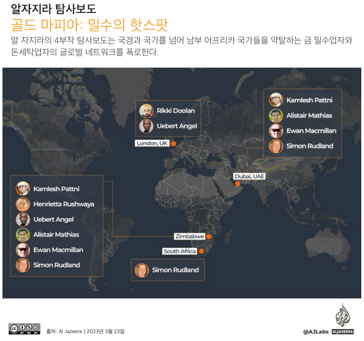 짐바브웨를 포함한 남부 아프리카에서는 매년 수십억 달러 규모의 황금이 밀반출되어 두바이로 흘러들어 가 더러운 자금의 돈세탁 경로가 되고 있다. 짐바브웨 정부는 황금 밀수를 서방의 제재를 우회하는 수단으로 사용하고 있다. 황금을 밀수하는 이 밀수업자 혹은 골드 마피아들은 대통령의 조카부터 교회 목사에 이르기까지 다양하다. 이 글은 알자지라 탐사보도팀이 이들 네트워크에 위장잠입하여 취재한 4부작 시리즈의 첫 번째 보도인 Who are the Gold Mafia? Godmen, conmen and a president’s niece의 번역으로 짐바브웨의 황금을 밀수하고 돈세탁하는 핵심 인물들이 누구인가를 다루고 있다. 기회가 된다면 알자지라에서 기사가 게재되는 대로 나머지 3개의 꼭지도 번역할 예정이다.