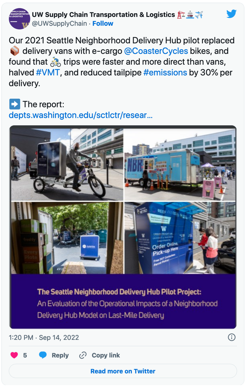 화물을 안전하고 지속 가능하며 신속하게 운송하는 동시에 증가하는 배송 횟수의 균형을 맞출 수 있는 방법이 있을까? 워싱턴 대학의 공급망 운송 및 물류 센터(Supply Chain Transportation and Logistics Center)에서는 아마존, 유피에스 등 해운, 운송, 부동산 분야의 기업들과 협력하여 이와 같은 질문에 답한다. 다음은 당사와 동료들이 소위 "라스트 마일(last mile)"이라고 부르는 패키지의 긴 여정의 마지막 단계에 대한 몇 가지 솔루션이다.