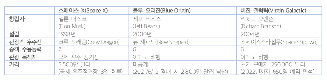 현재 우주 관광분야에서 공식적으로 알려진 스페이스 X와 블루 오리진, 버진 갤럭틱의 경쟁은 아래와 같다. 관광객 수용량과 관광객 수요는 더 늘어날 전망이다.