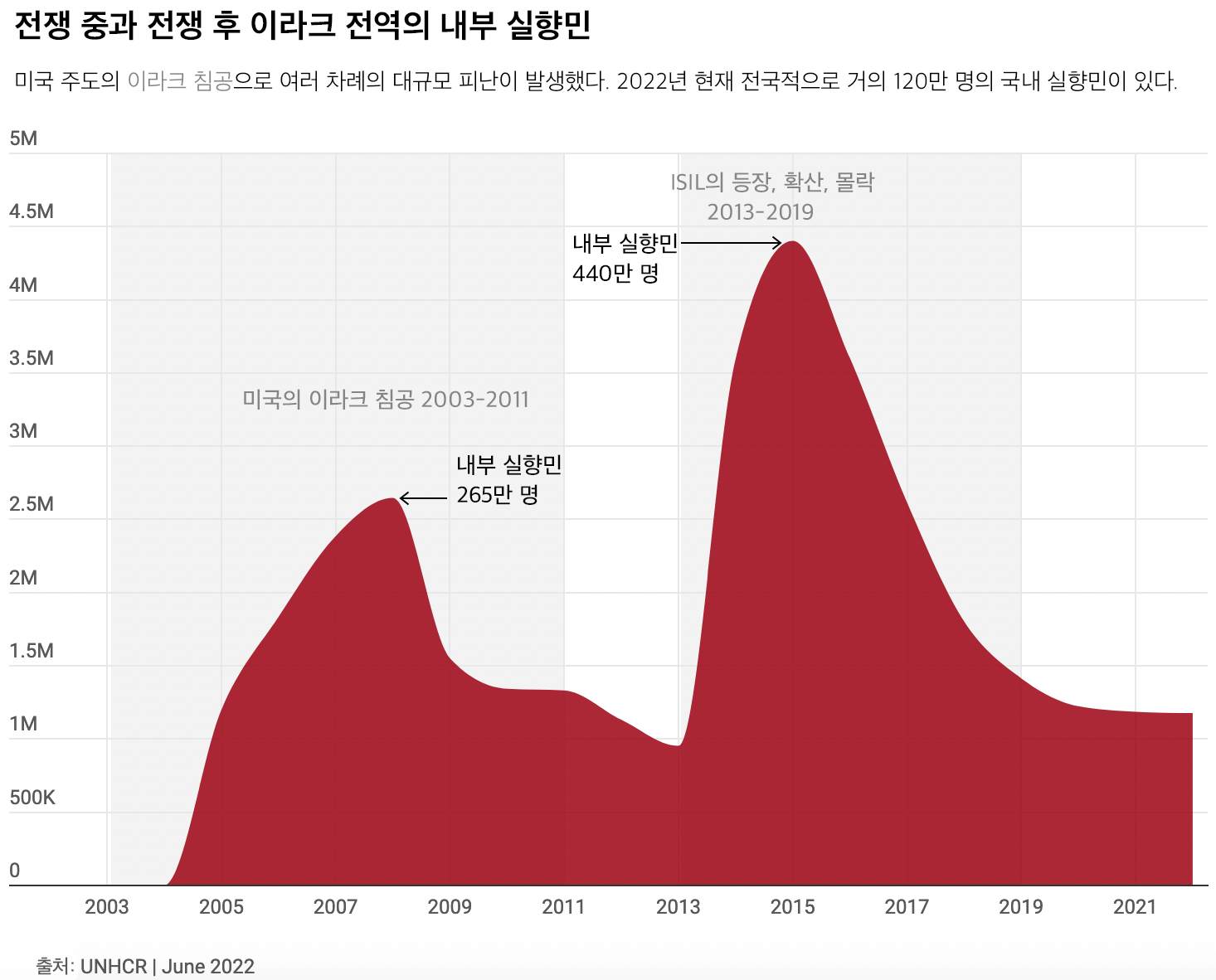 그러나 2013년부터 2019년까지 ISIL의 흥망성쇠와 함께 IDP의 수가 다시 증가하여 2015년에는 440만 명으로 정점에 도달했다.