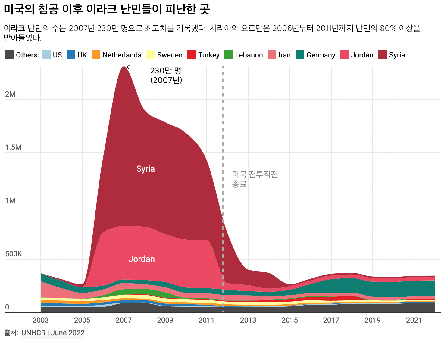 2022년 현재 유엔은 주로 독일(44%), 요르단(10%), 이란(10%)에 거주하는 345,305명의 이라크 난민을 등록했다. 아래 인포그래픽은 미국의 침공 이후 이라크 난민들이 어디로 피신했는지를 보여준다.