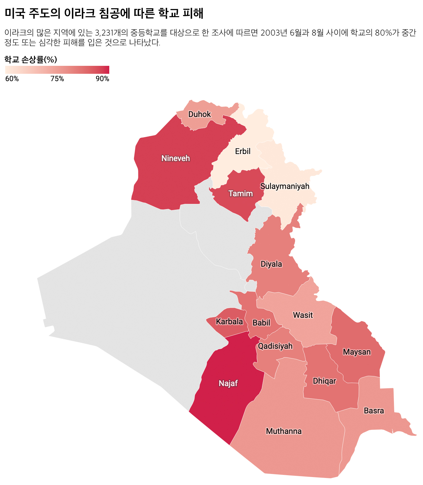 이라크 교육부가 전국 3,200개 이상의 중학교를 대상으로 실시한 조사에 따르면 2003년 6월과 8월 사이에 학교의 80%가 중간 정도 또는 심각한 피해를 입은 것으로 나타났다.