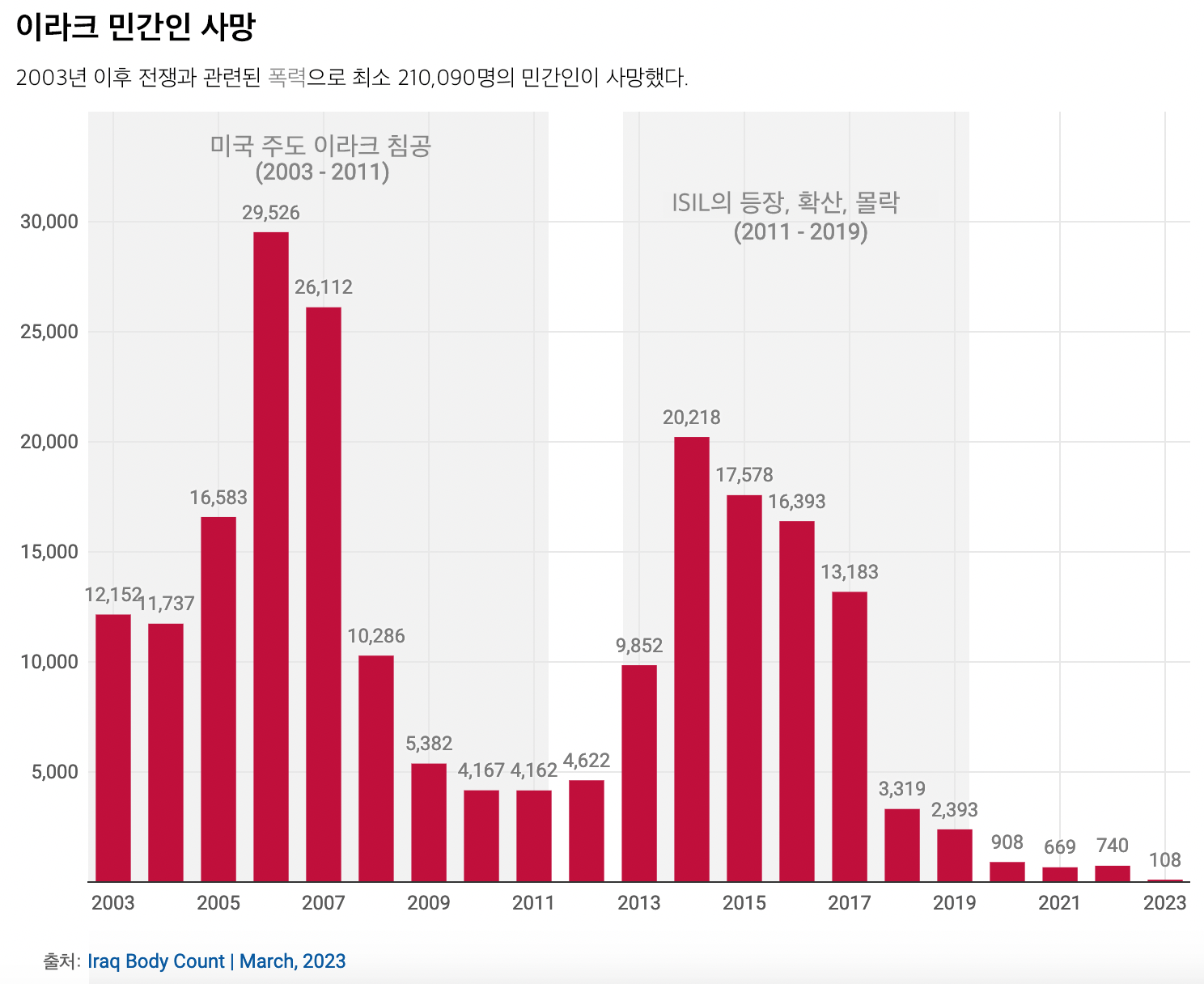 이라크 바디 카운트(Iraq Body Count, 2003년 이라크 침공 이후 폭력에 의한 사망자를 기록하는 단체 - 역자 주)에 따르면 2003년 이후 전쟁과 관련된 폭력으로 적어도 210,090명의 민간인이 사망자가 발생했다. 연간 사망자 수가 가장 많은 것은 2006년으로, 약 3만 명의 민간인이 사망했다.