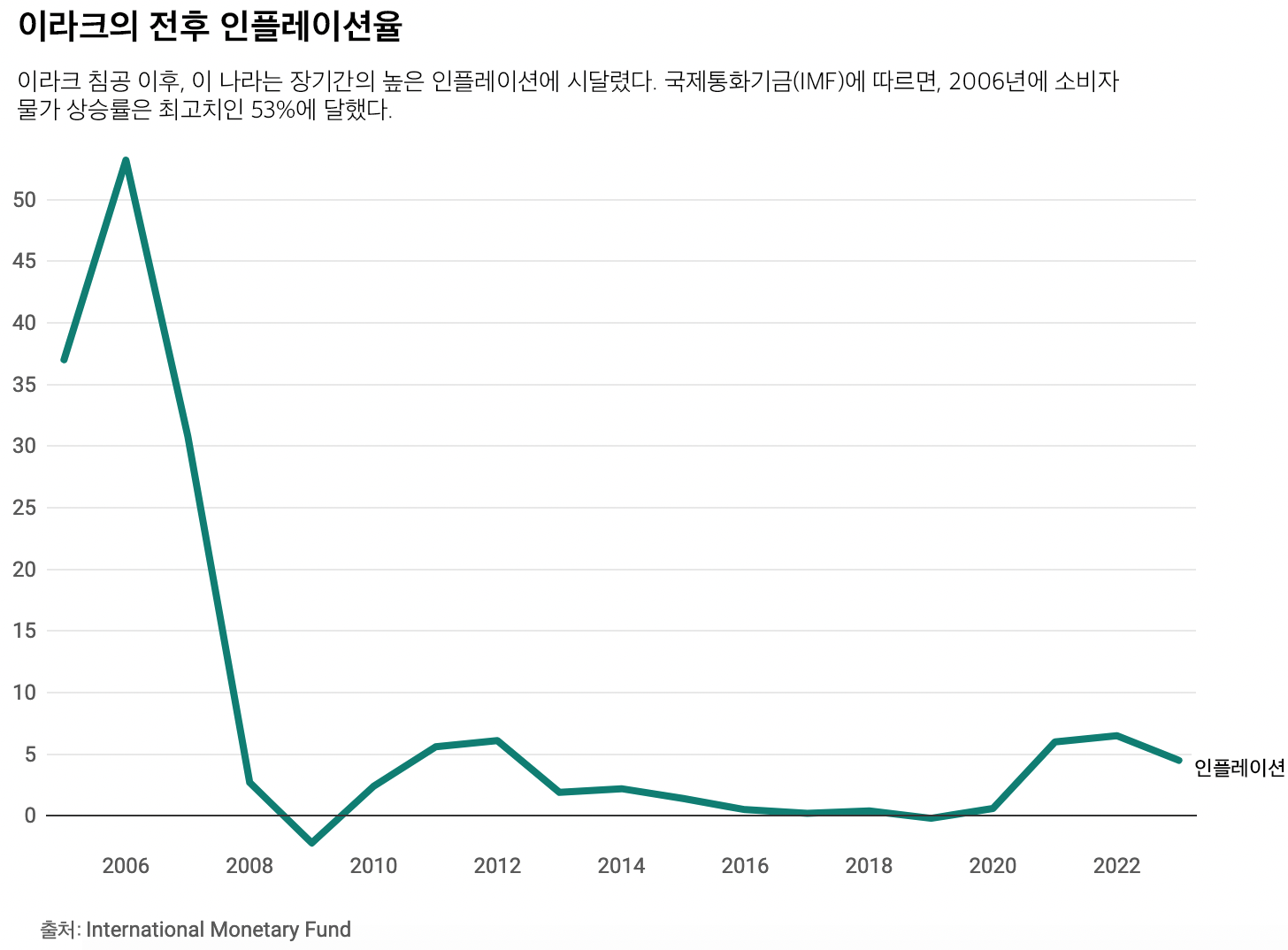 이라크 침공 이후, 이 나라는 장기간의 높은 인플레이션에 시달려왔다. 국제통화기금(IMF)에 따르면 2006년 소비자물가 상승률은 최고치인 53%를 기록했다.