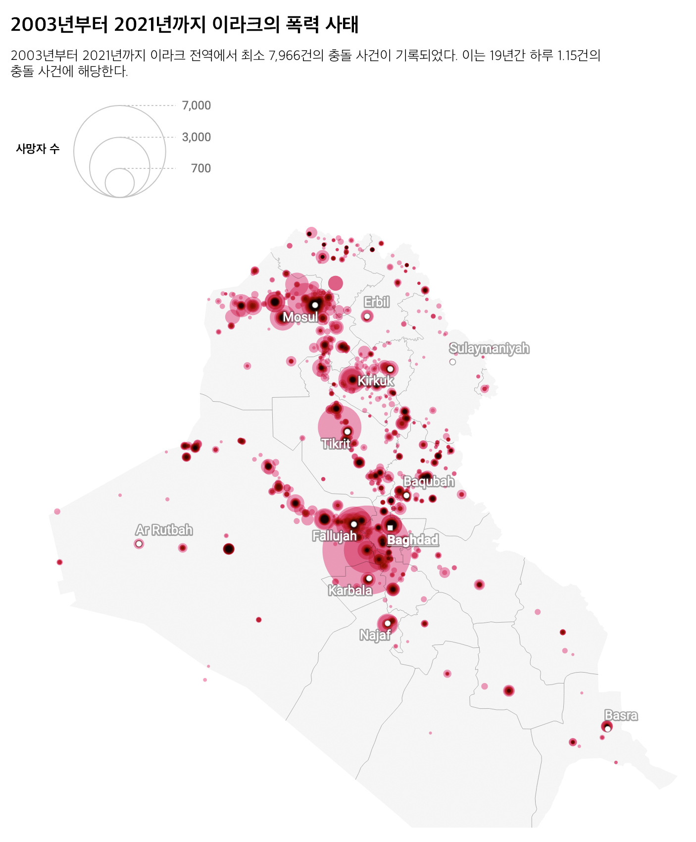 폭력사태의 60% 이상(4,955건)이 니네베(Nineveh), 바그다드(Baghdad), 알-안바르(Al-Anbar) 등 3개 지방에서만 발생했다. 아래 지도는 이러한 폭력적인 충돌이 발생한 곳을 강조한다.