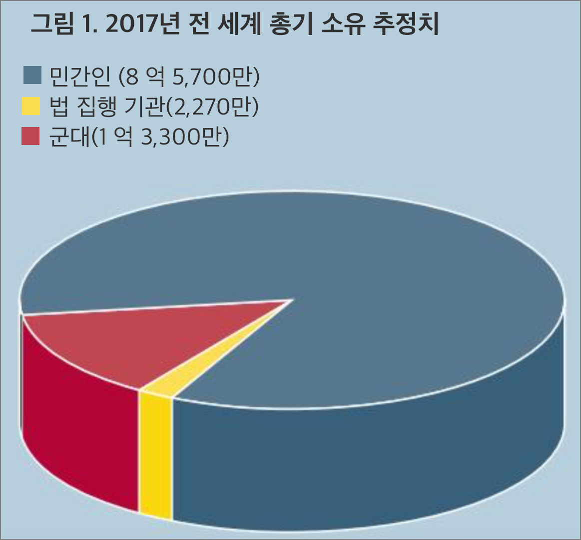 소형 무기 조사(Small Arms Survey)에 사용된 출처와 방법에 따르면 2017년 말 현재 230개 국가와 자치령에 약 8억 5,700만 개의 민간인 보유 총기가 있다(박스 1 참조) 새로운 수치는 2006년 '소형 무기 조사'가 약 6억 5천만 개의 민간인 보유 총기를 추정했던 이전의 세계 수치보다 32%(2억 7백만 개 더 많은) 증가한 것이다(Small Arms Survey, 2007, p. 39).