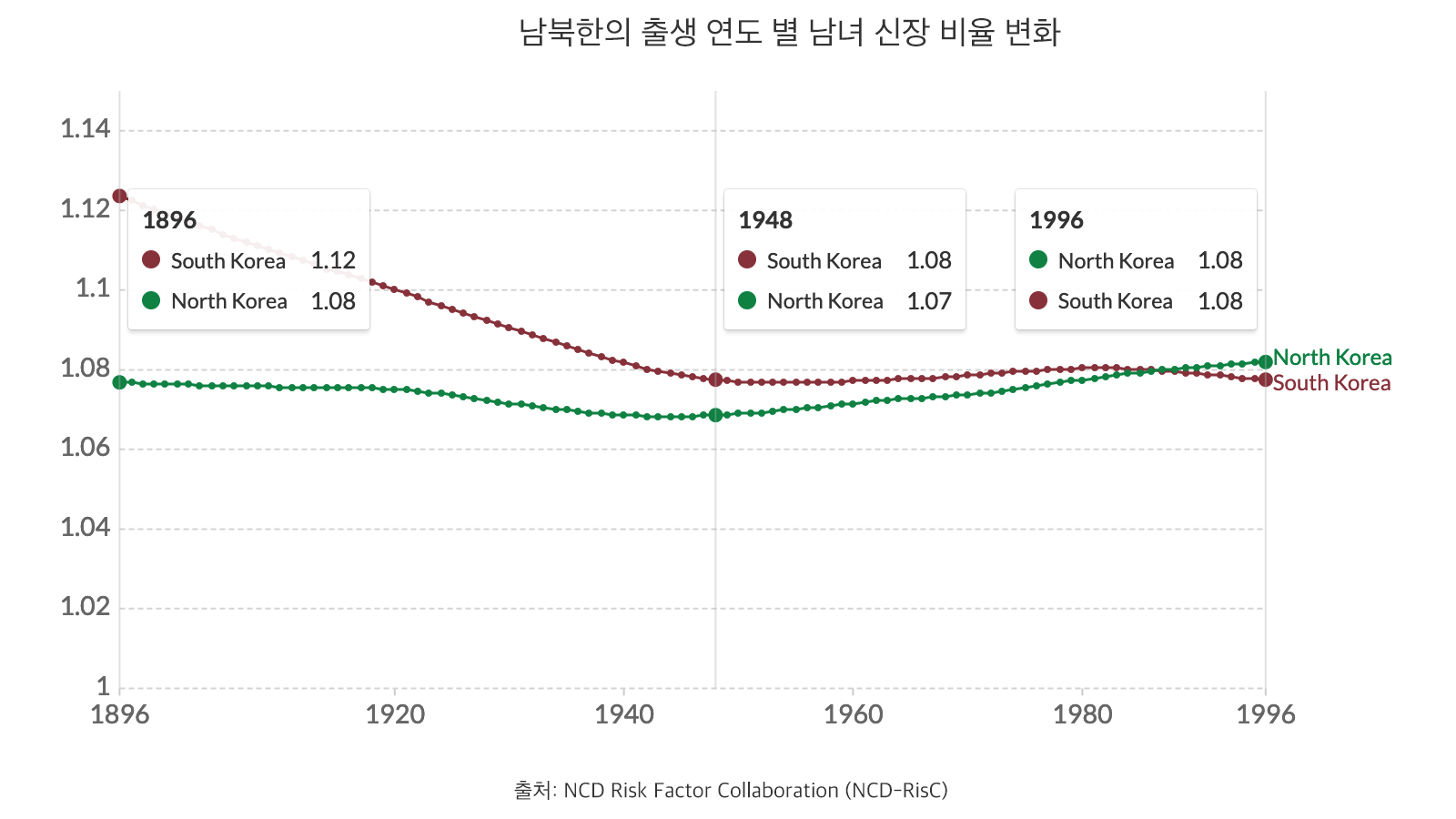 남과 북의 신장을 비교하면서 간과하지 말아야 할 사실은 인류의 키와 관련된 글에서도 다루었지만, 지난 한세기 동안 한국 남성과 여성의 키 성장은 세계적으로 거의 예외적인 속도였다는 사실이다. 한국의 1인당 GDP의 가파른 증가와 증가율 세계 1위에 오를 정도로 높은 육류소비는 한국 남녀의 높은 키 성장률과 무관하지 않다. 한국 남성 평균신장 15.7cm 증가는 세계에서 3번째로 높은 증가율이다. 한국 여성의 평균신장 20cm 증가는 세계 1위이다. 아래 도표를 보면 남북한 성인 남녀의 출생연도에 따른 성별 키 비율이다. 1보다 큰 값은 남성 평균 키가 여성 평균보다 크다는 것을 의미하며, 세계평균은 107이다. 1896년 출생자와 1996년 출생자 북한 성인남녀의 키 비율은 108로 변화가 없다. 하지만 남한 성인남녀의 키 비율은 1896년에 출생한 남녀의 비율은 1.12였으나 1996년에 출생한 한국 남녀의 비율은 1.08로 그 차이가 -4% 줄어들었으며, 이는 같은 기간 전 세계 성인남녀 키 비율 격차 감소 폭 중 제일 큰 폭이다.