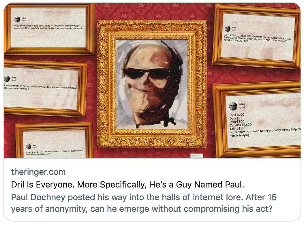 * 역자 주: 드릴(Dril)은 약 180만 명의 팔로워를 가진 유명 트위터러다. 2008년 첫 트윗 이후 드릴은 초현실적이고 아이러니한 유머 감각을 공유하는 사이트의 하위 문화인 '이상한 트위터'와 관련된 가장 주목할 만한 계정 중 하나가 되었다. 드릴과 관련된 캐릭터는 매우 독특하며, 종종 전형적인 미국 남성 인터넷 사용자의 기괴한 반영으로 묘사된다. 다른 소셜 미디어 사용자들은 다양한 정치적, 문화적 맥락에서 유머러스하거나 풍자적인 효과를 위해 드릴의 트윗을 변형해 사용하곤 한다. 드릴의 트윗, 문구, 트로피 중 많은 것들이 인터넷 속어의 친숙한 부분이 되었다.