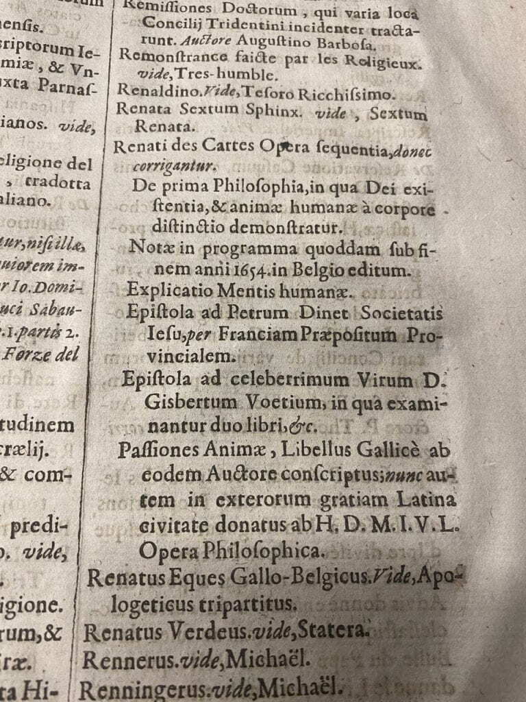 | 가톨릭 도서관 금서 목록(Index Librorum Prohibitorum) 1564년 판 표지 | 금서 목록 중 르네 데카르트(René Descartes) 섹션. 첫 줄에 '방법 서설'(Meditationes de Prima Philosophia)이 보인다. |