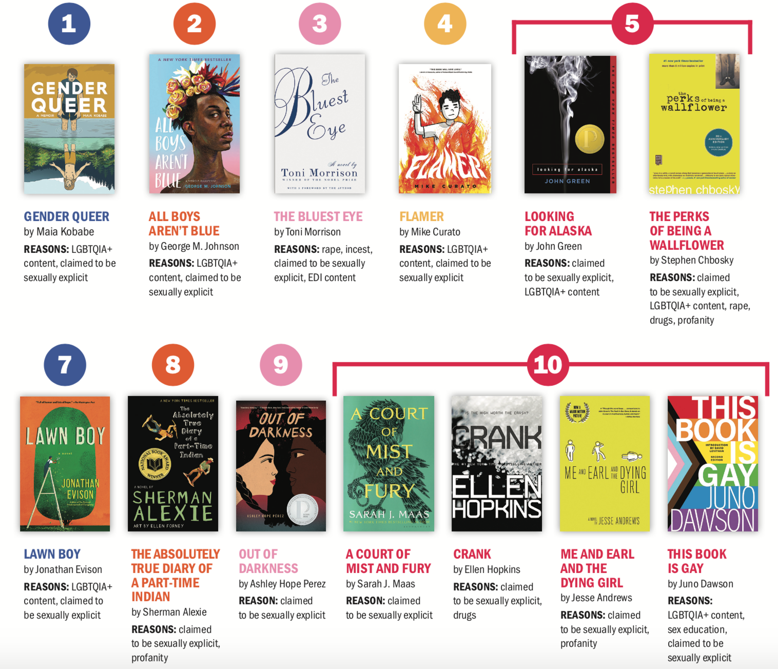 미국 도서관 협회(American Library Association, ALA)의 지적 자유 사무소(Office of Intellectual Freedom)에 따르면, 지난해 고유 출판물에 대한 도전 건수가 2021년에 비해 거의 40% 증가했다. ALA는 2,571개의 고유 출판물이 2022년에 금지되거나 도전을 받았다고 말한다. 펜 아메리카(PEN America)에 따르면 2021년 7월부터 2022년 6월까지 금지된 출판물 중 40%가 주인공이나 주요 등장인물이 유색인종이었고, 21%는 인종이나 인종차별 문제가 있는 출판물이었다. 펜 아메리카에 따르면 도전받거나 금지된 타이틀 중 41%는 LGBTQIA+ 정체성 및 주제와 관련된 콘텐츠를 가지고 있다. 금지된 책 1위는 마이아 코바베(Maia Kobabe)의 '젠더 퀴어'(Gender Queer)로, 코바베가 자신의 성별과 퀴어 정체성을 탐구하는 여정을 따라가는 그래픽 회고록이다. 보수적인 티파티 운동, 트럼프의 마가(MAGA, Make America Great Again, '미국을 다시 위대하게')와 백인 우월주의자들 및 음모론의 득세, 그리고 최근의 학교에서 비판적 인종이론 관련 교육 금지 운동의 확산은 미국 정치의 양극화와 함께 책 금지를 하나의 우파들의 풀뿌리운동으로 만들고 있다.